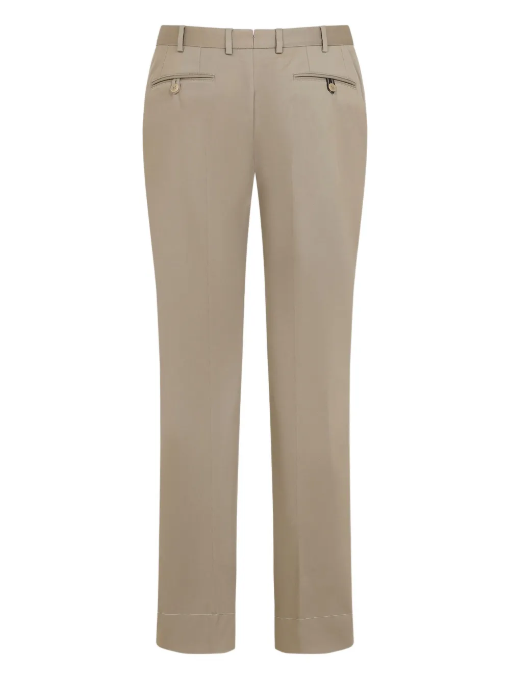 Песочного цвета саржевая ткань, застежка-молния спереди, прорезные карманы сзади, прямые брючины, шлевки для ремня