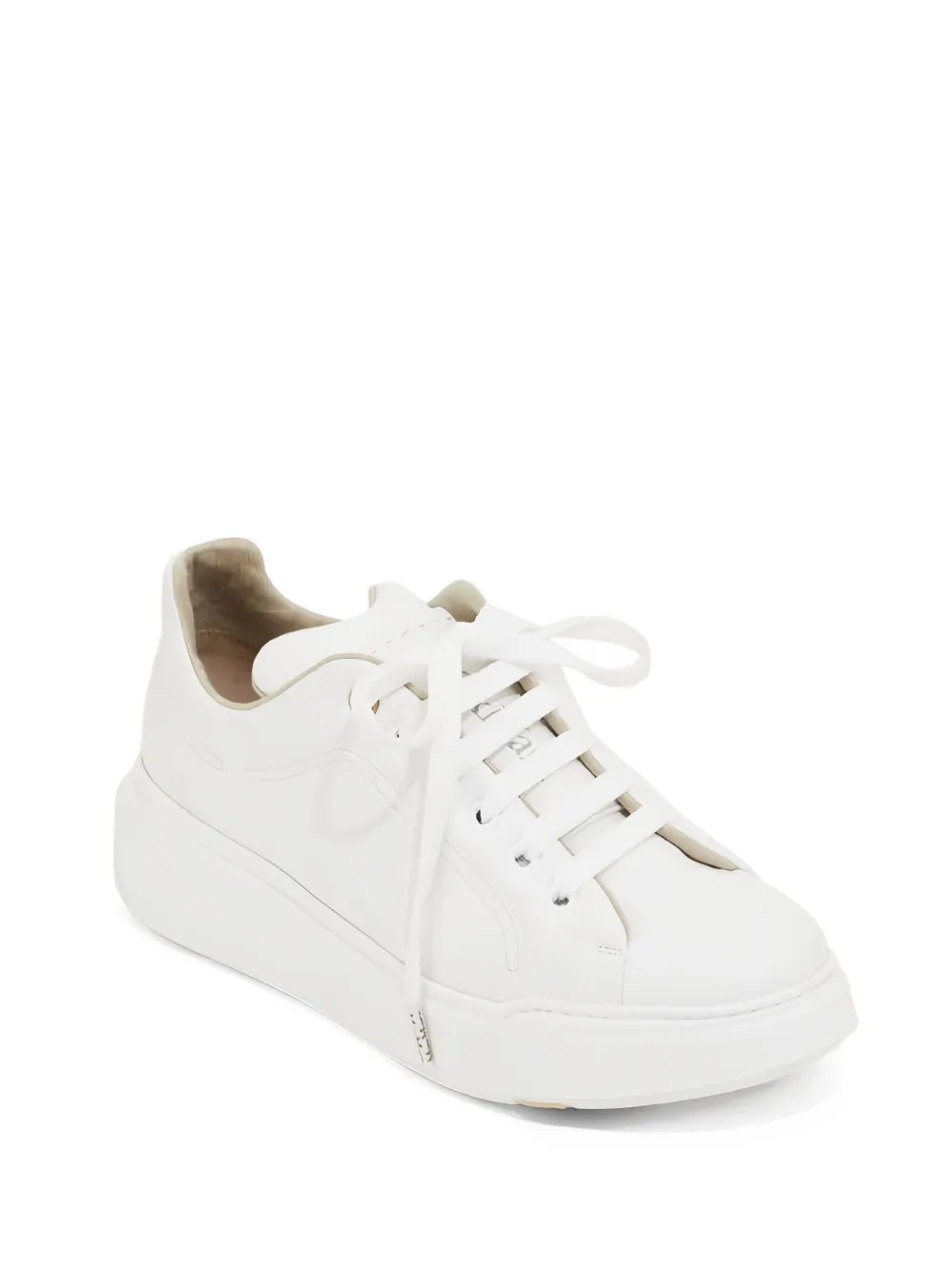 Белый кожаный верх, плоские шнурки, мягкий язычок, аккуратные строчки, массивная платформа