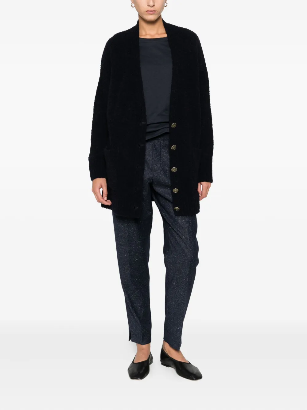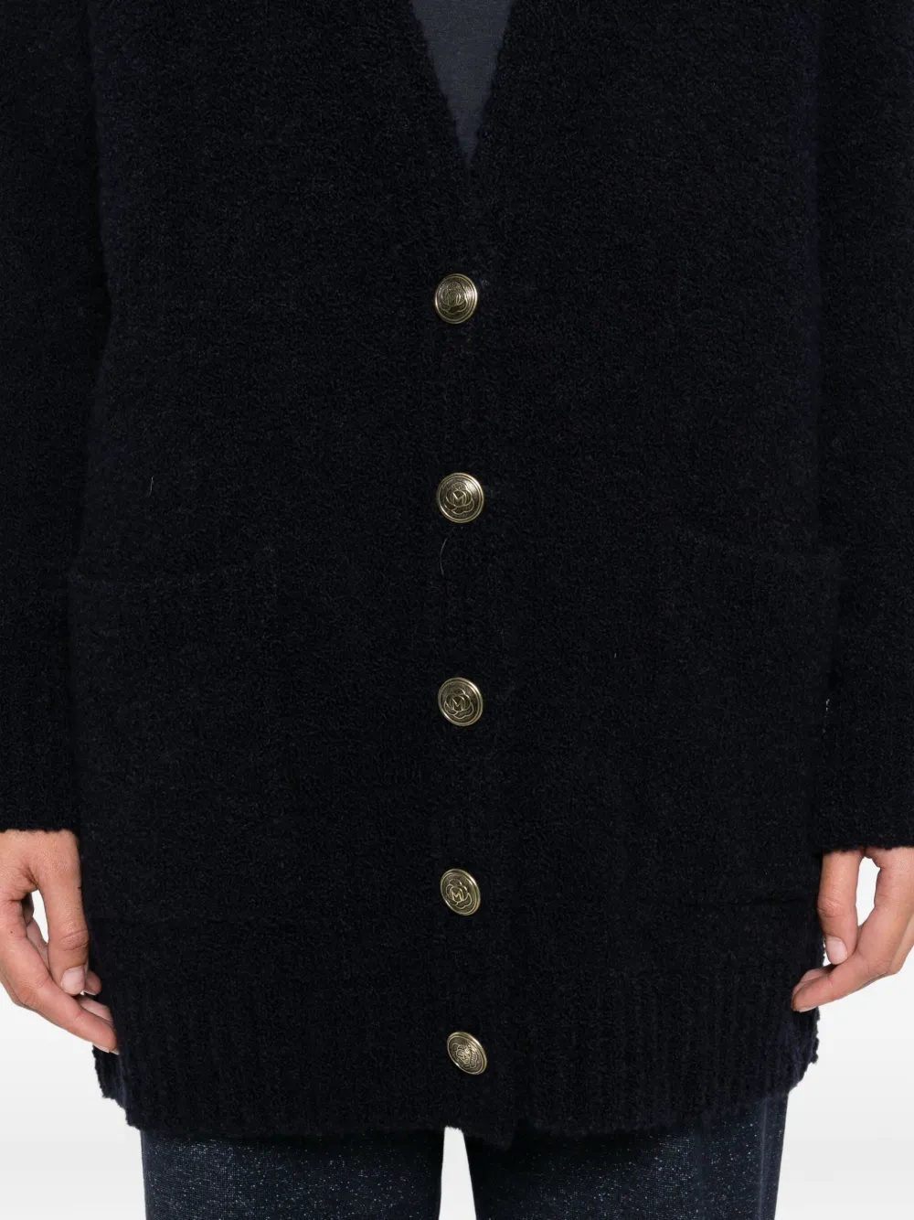 Черный вязаный в рубчик накладные карманы спереди V-образный вырез застежка на пуговицы спереди длинные рукава
