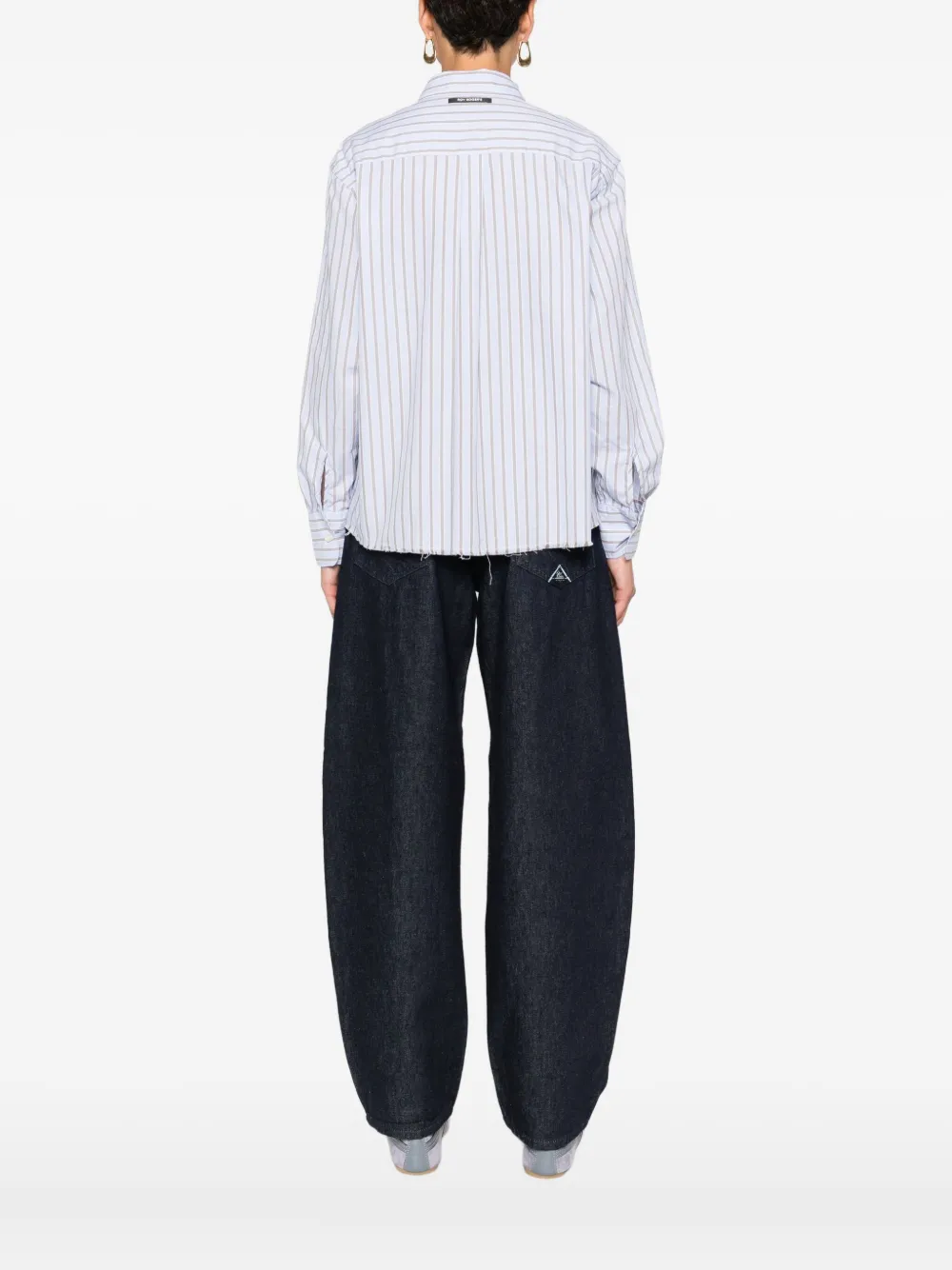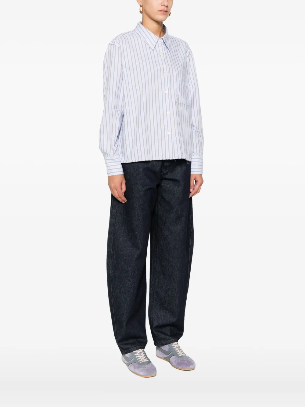 Светло-голубые вертикальные полоски, длинные рукава, застежка на пуговицы, нагрудный карман