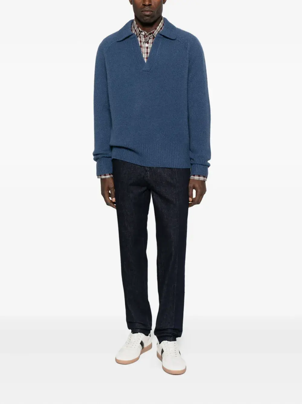 Темно-синий, застежка на пуговицы, два диагональных кармана по бокам, два прорезных кармана сзади, шлевки для ремня, нашивка с логотипом