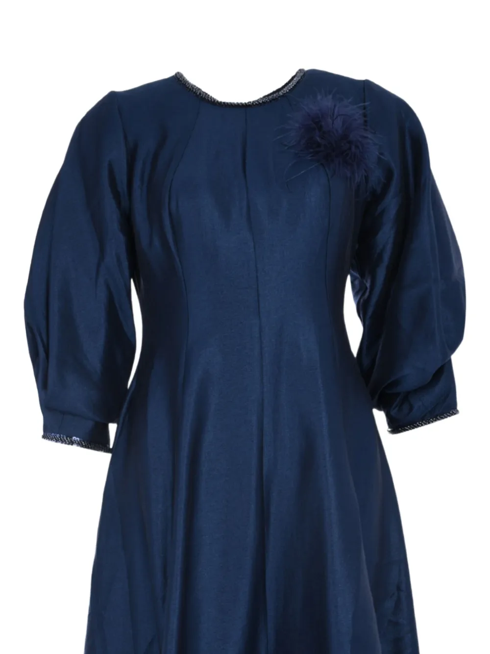 Темно-синий украшение из перьев укороченные рукава-фонарики манжеты, украшенные пайетками приталенный лиф юбка А-силуэта