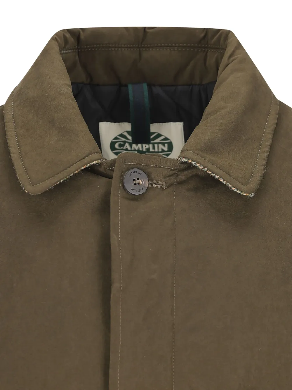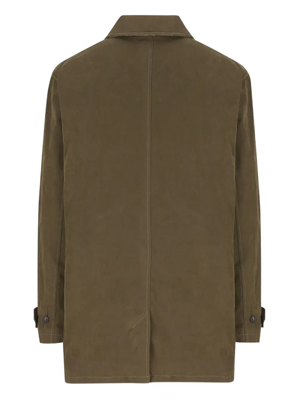 Оливково-зеленый цвет, воротник-стойка, потайная передняя застежка, прорезные карманы, длинные рукава, манжеты на пуговицах