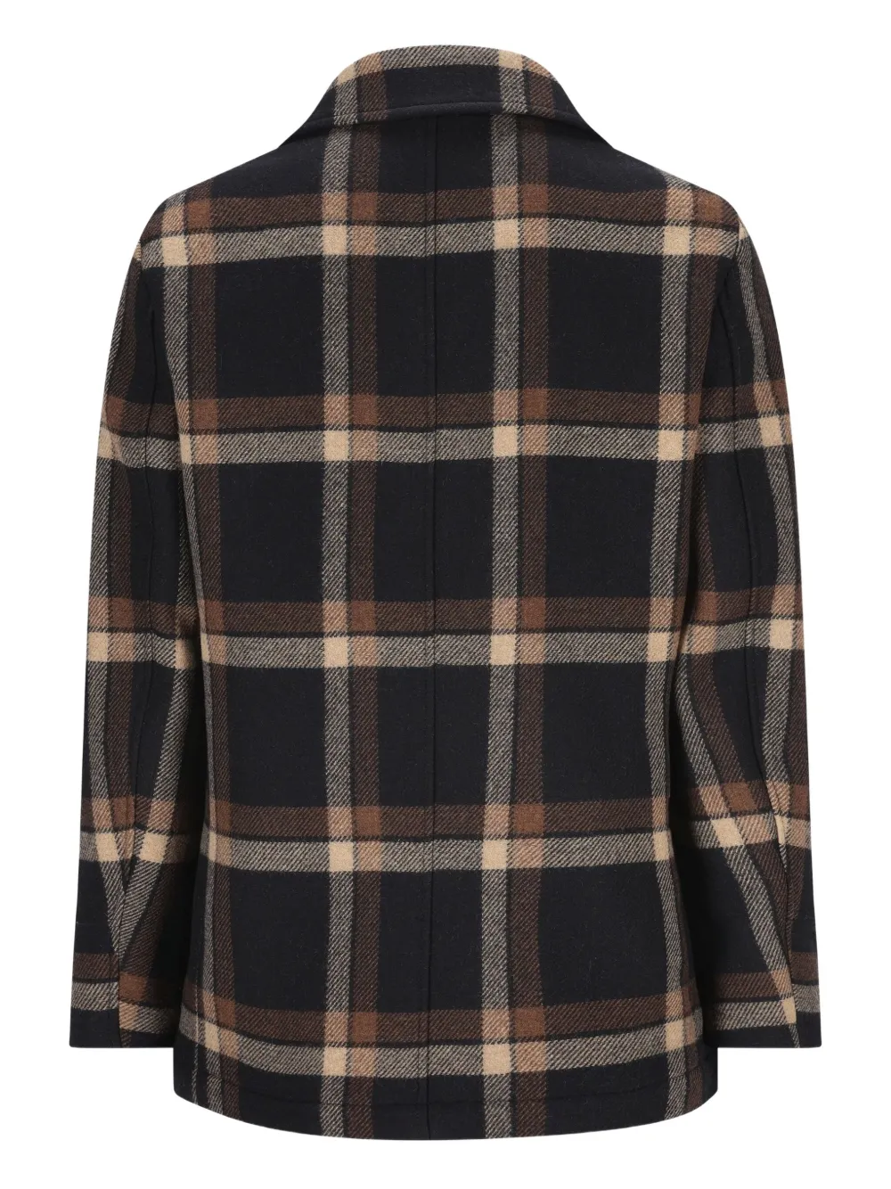 Темно-синий, коричневый, бежевый клетчатый узор, двубортная застежка, воротник с отделкой из веревки, металлические пуговицы, карманы для рук