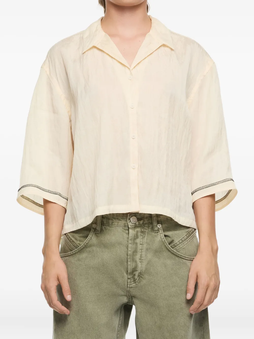 Слоновая кость рукава три четверти застежка на пуговицы воротник-стойка деталь со шнурком отделка черной строчкой