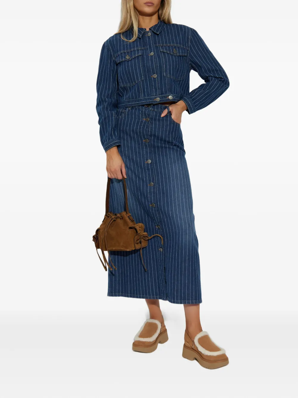 Индиго синий цвет, узор в тонкую полоску, застежка на пуговицы, укороченная длина, длинные рукава, кожаная нашивка с логотипом