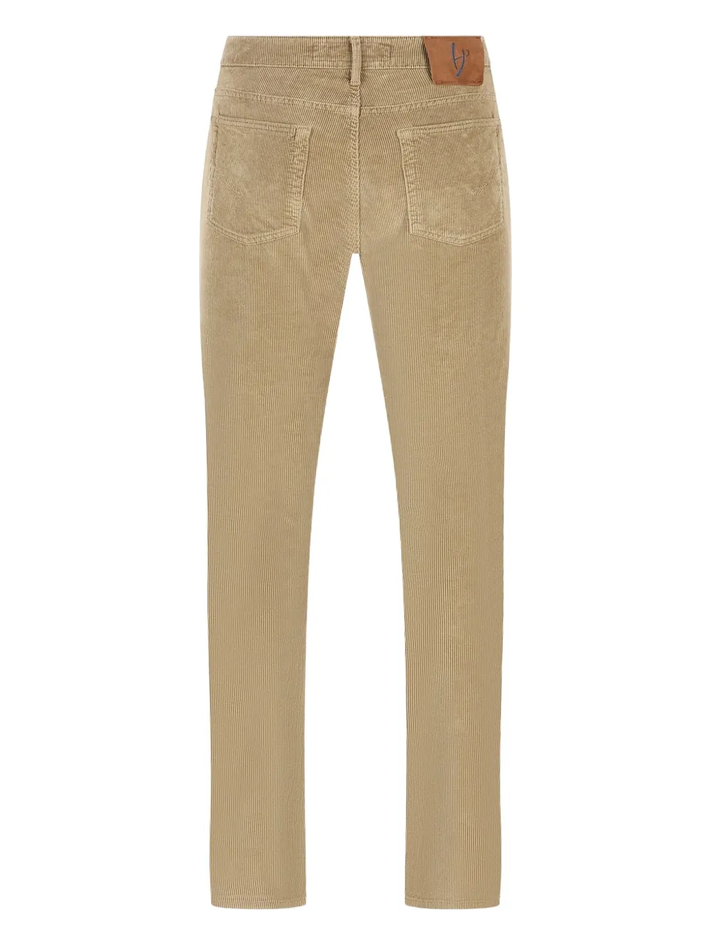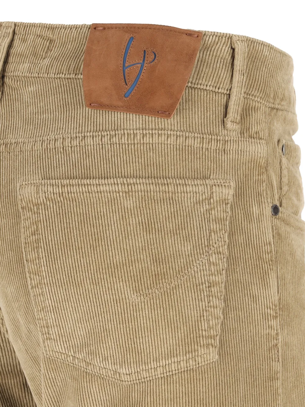 Бежевый вельвет, фактура, пять карманов, застежка на пуговицах спереди, нашивка с логотипом сзади, прямые брючины