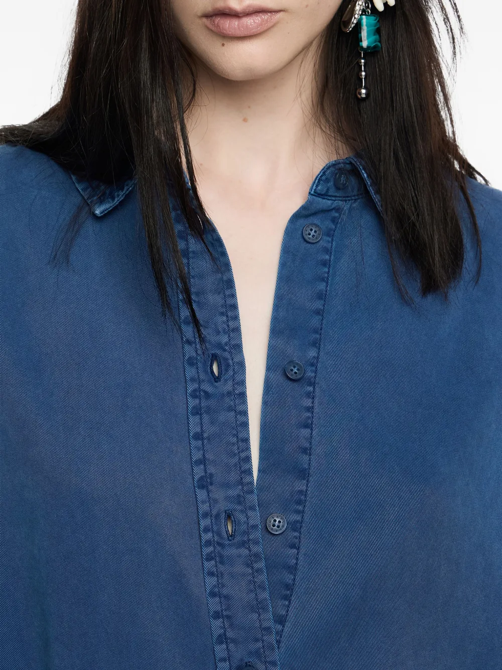 Синий длинные рукава застежка на пуговицы воротник закругленный подол