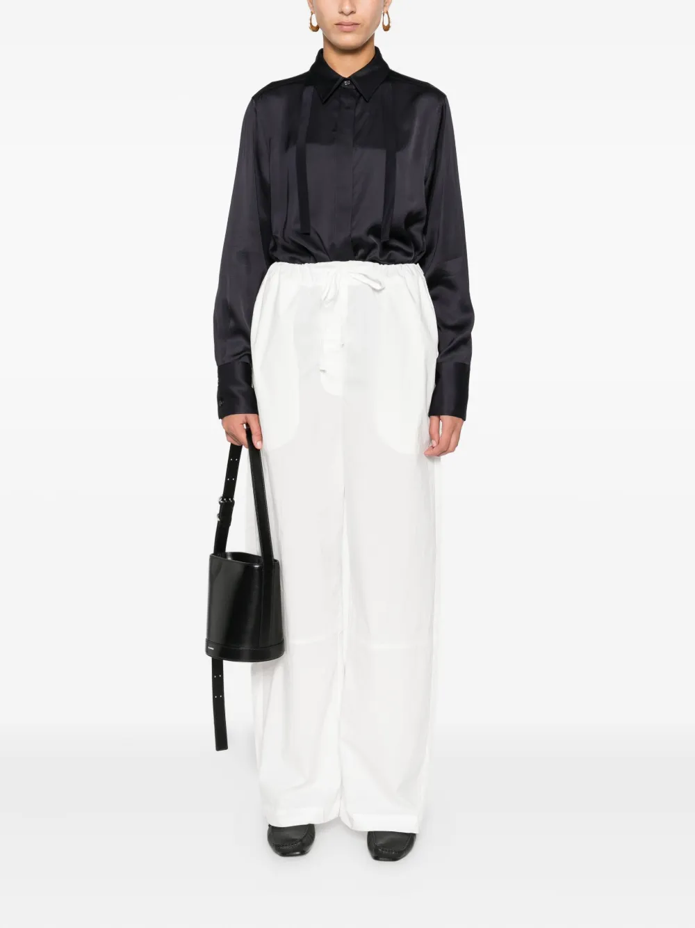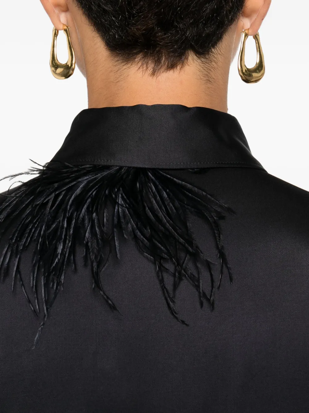 Черный сатиновая текстура классический воротник длинные рукава застежка на пуговицы спереди детали в виде ленты