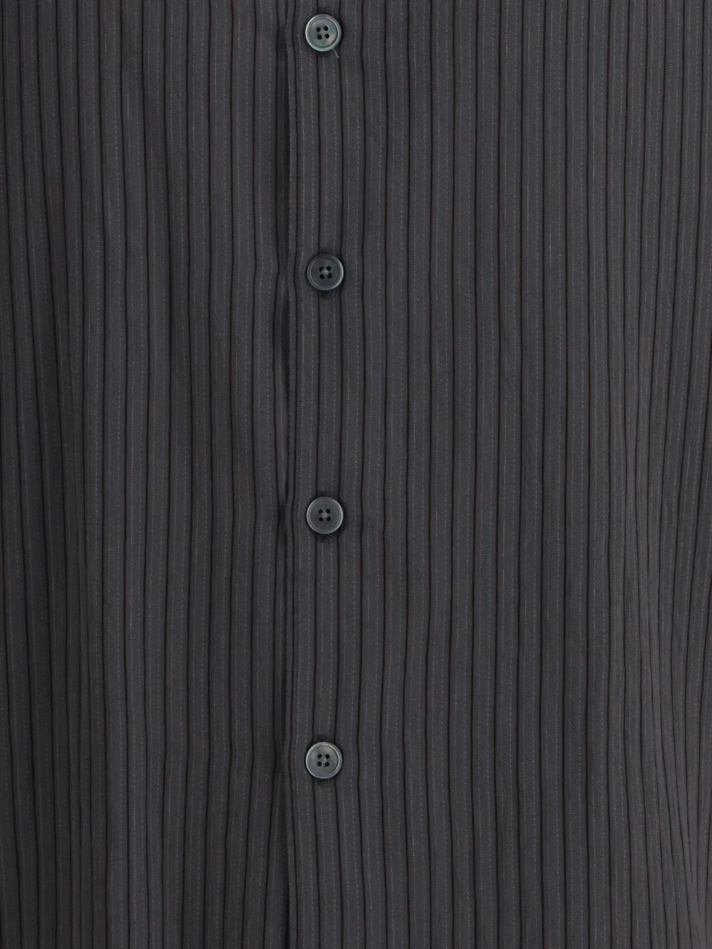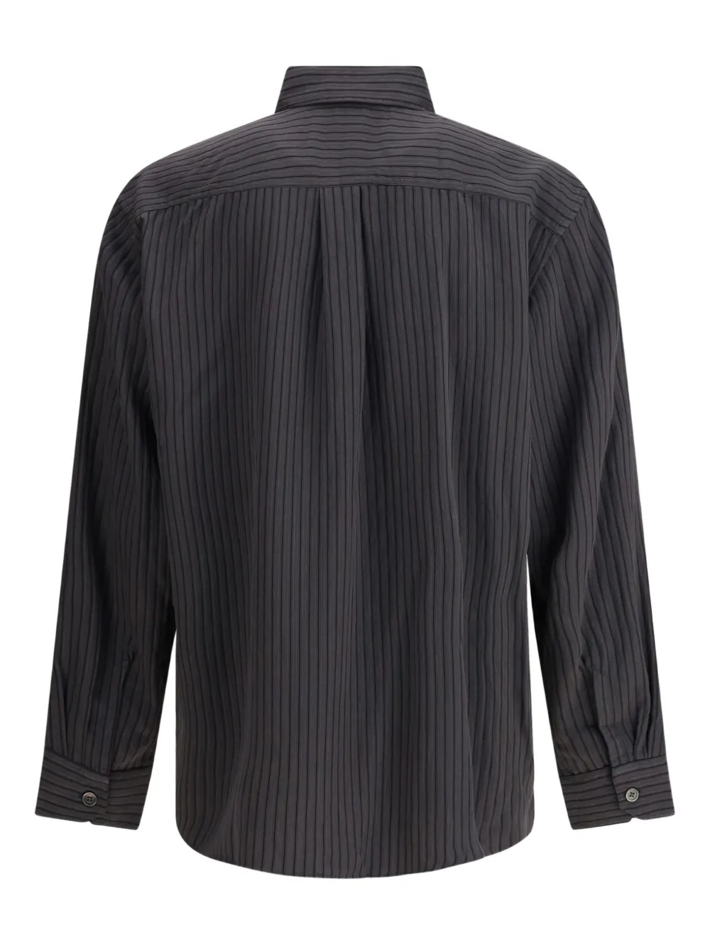 Темно-серая рубашка в тонкую полоску с длинными рукавами, застежкой на пуговицы, классическим воротником и прямым подолом