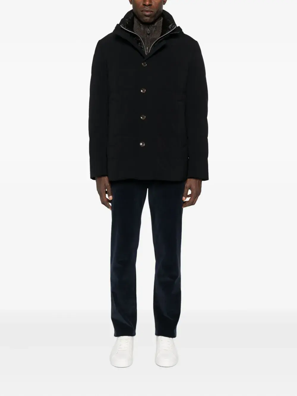 Черный капюшон многослойный дизайн застежка-молния спереди застежка на пуговицы спереди длинные рукава прямой подол