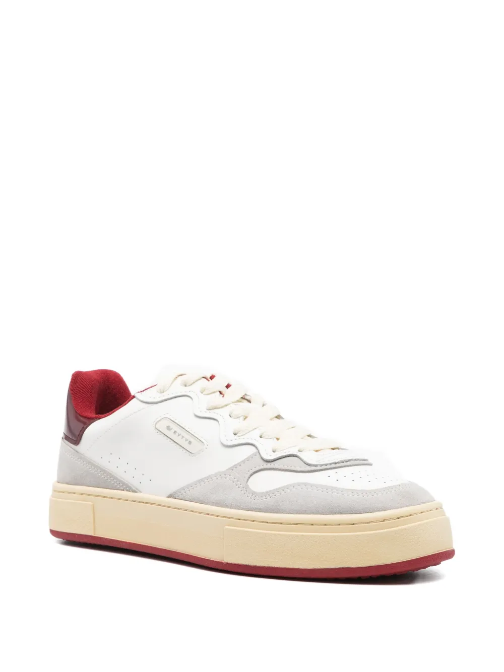 Белые кожаные вставки, замшевые накладки, кремовая промежуточная подошва, бордовая пятка, шнуровка