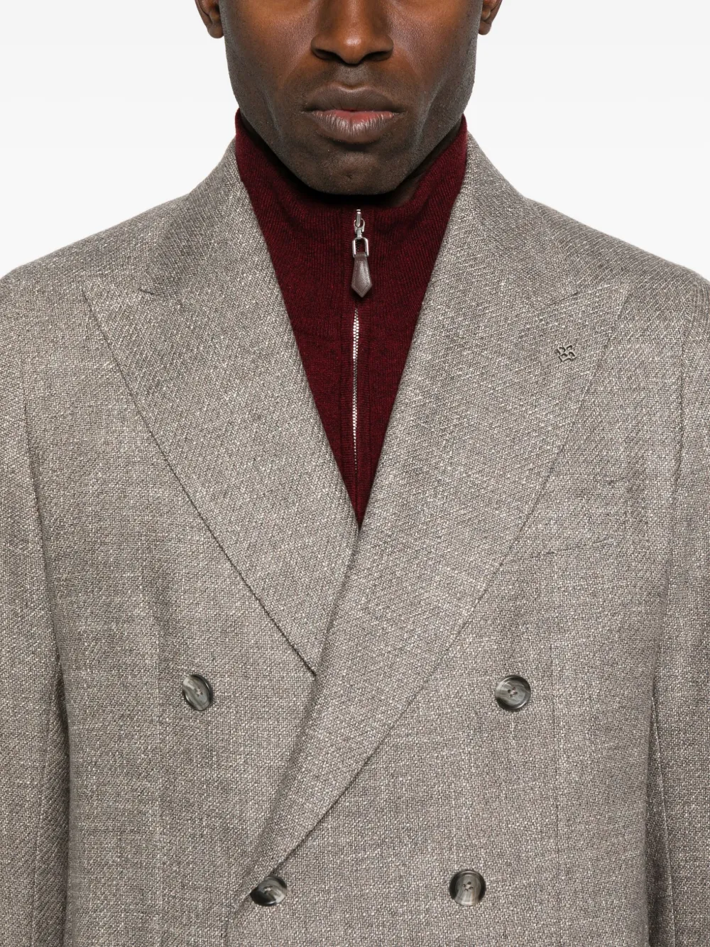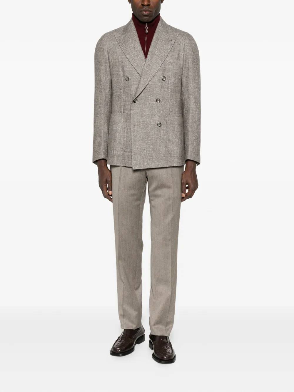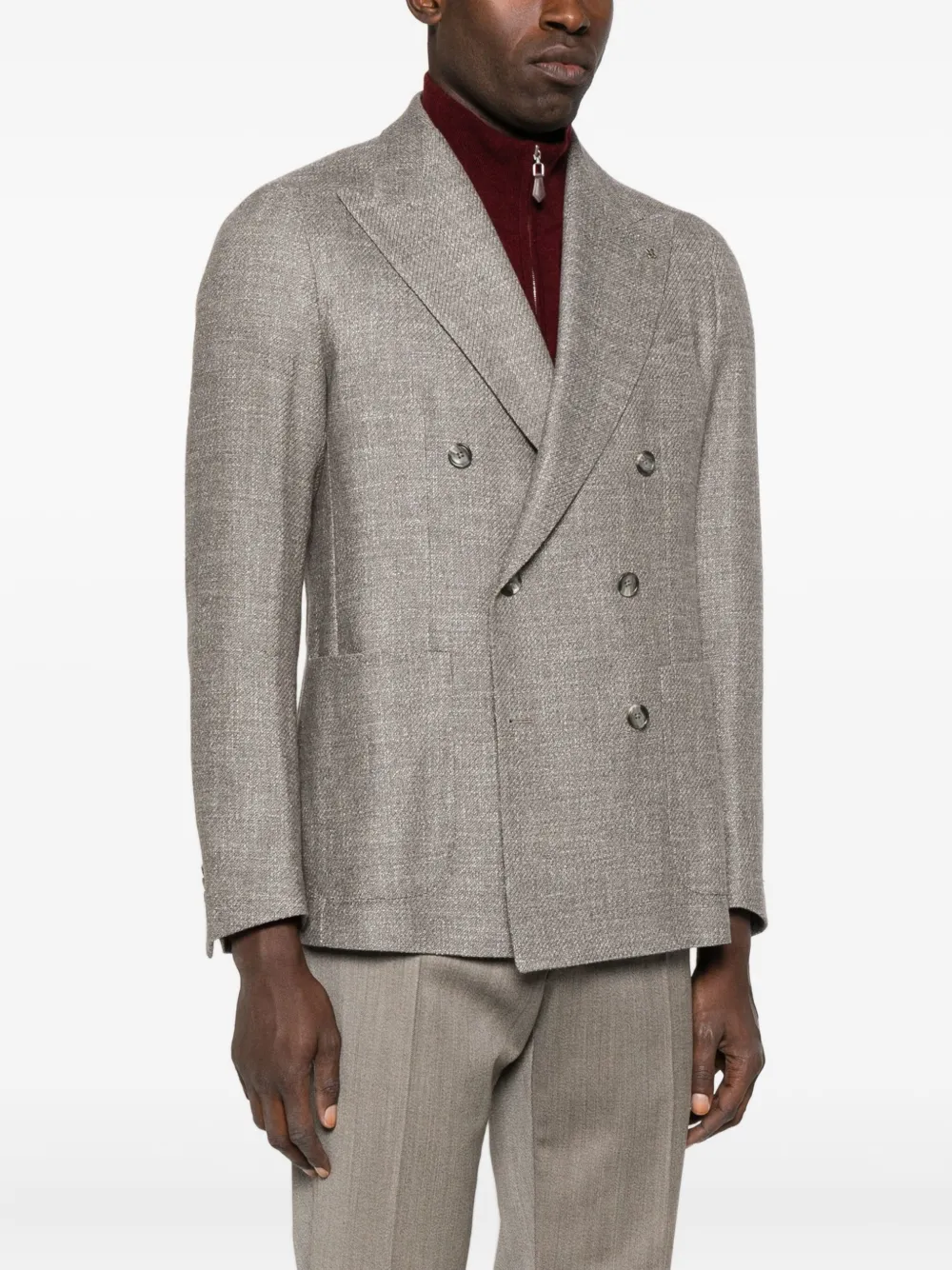 Тауpe (серо-коричневый)двубортная застежкаостроугольные лацканытекстурированная тканьнакладные карманыдлинные рукава