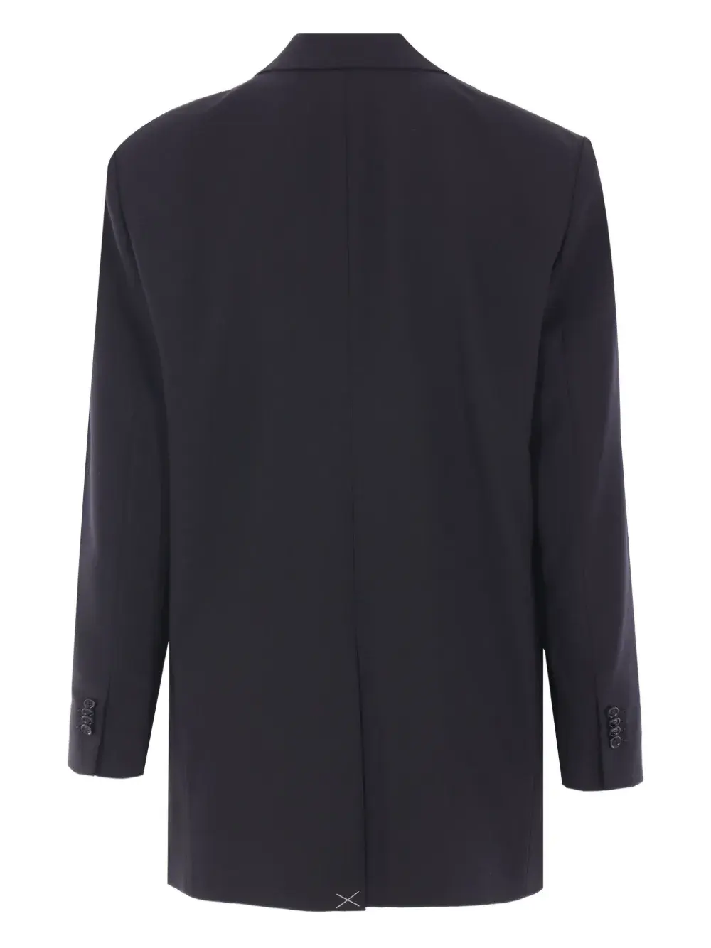 Черный двубортный пиджак с застежкой на пуговицы, лацканами с острыми концами, накладными карманами, длинными рукавами с пуговицами на манжетах и центральной шлицей сзади