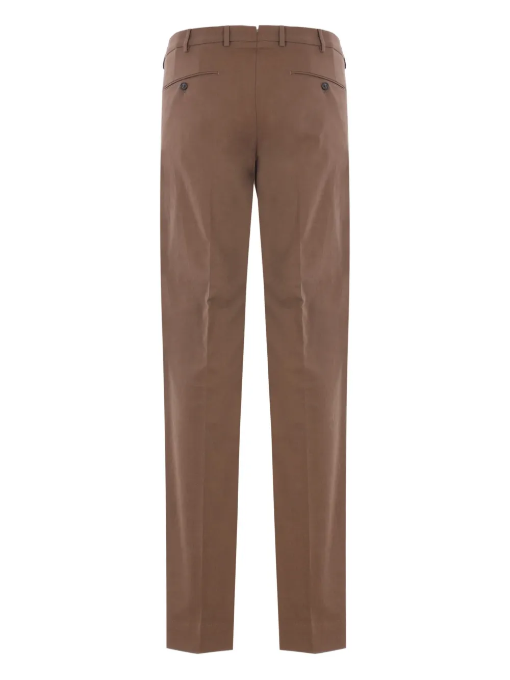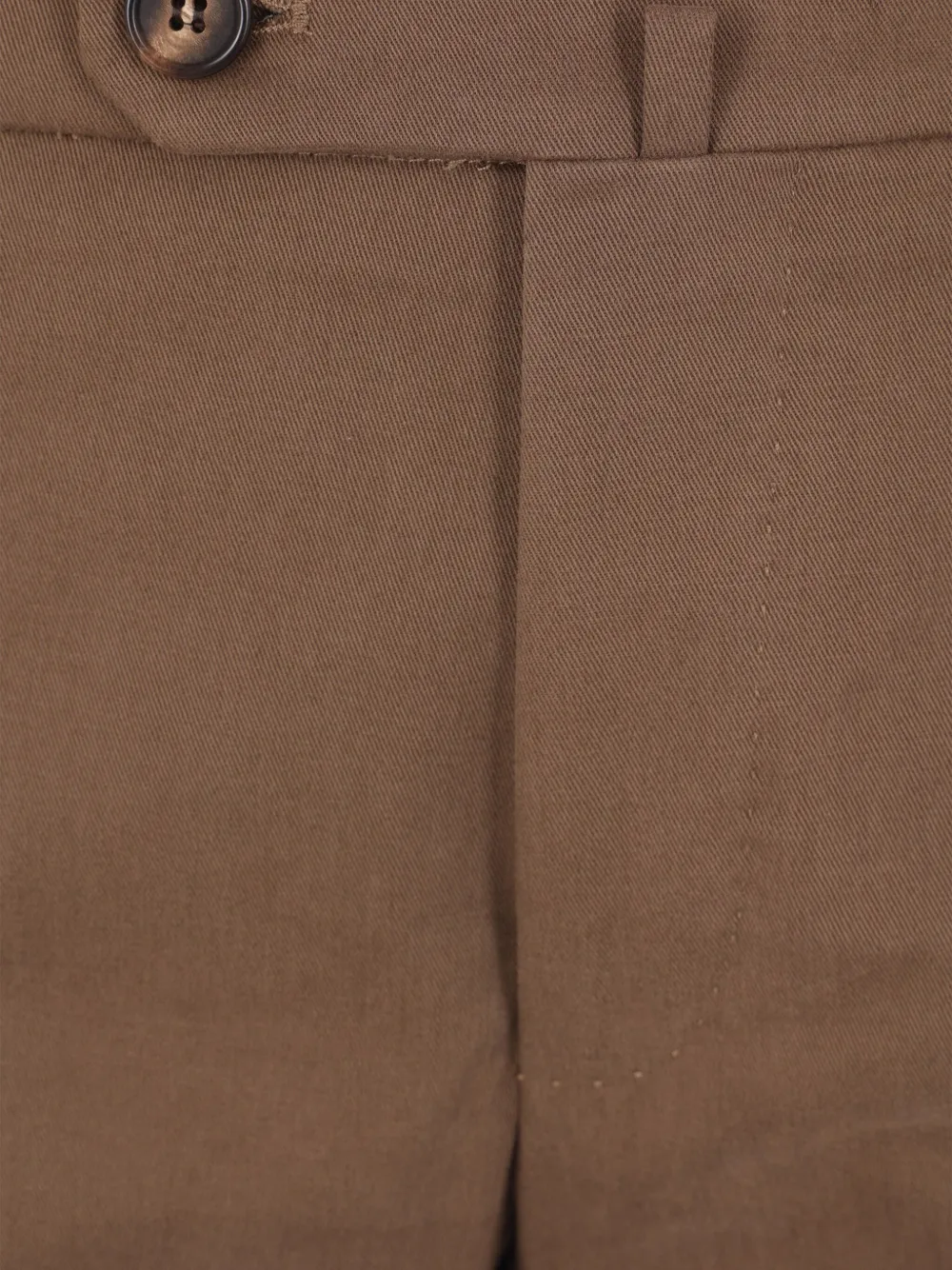 Коричневые брюки с центральной складкой, застежкой на пуговицах, несколькими карманами, шлевками для ремня и текстурой габардина