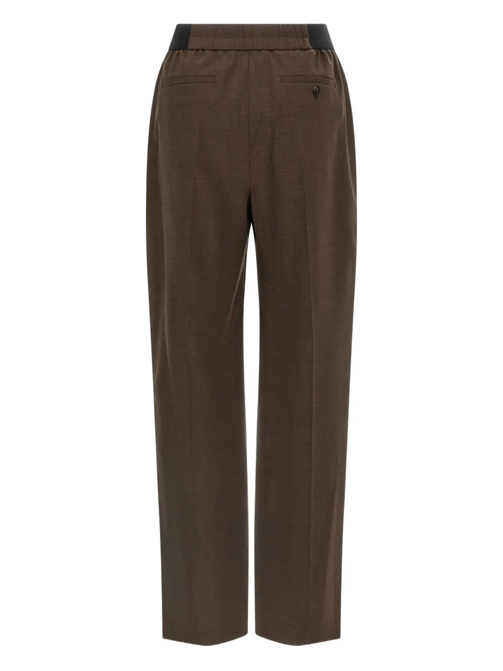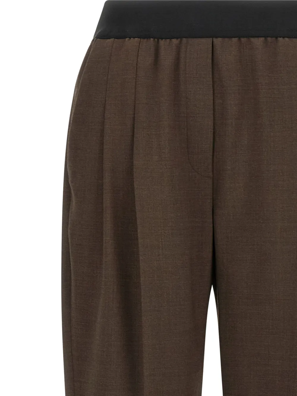 Коричневый пояс на резинке, отделка-тромплей с имитацией клапанов, растянутые плиссированные карманы, застежка на пуговицы