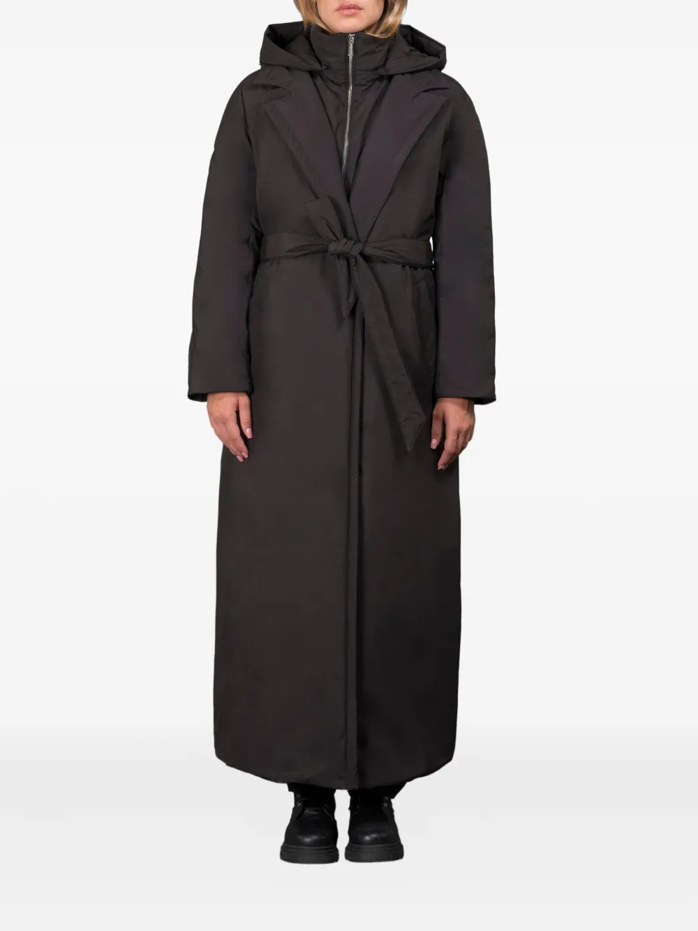 Черный цвет, капюшон, вырез с капюшоном, пояс на завязке на талии, удлиненная длина, застежка на молнии, стеганый эффект