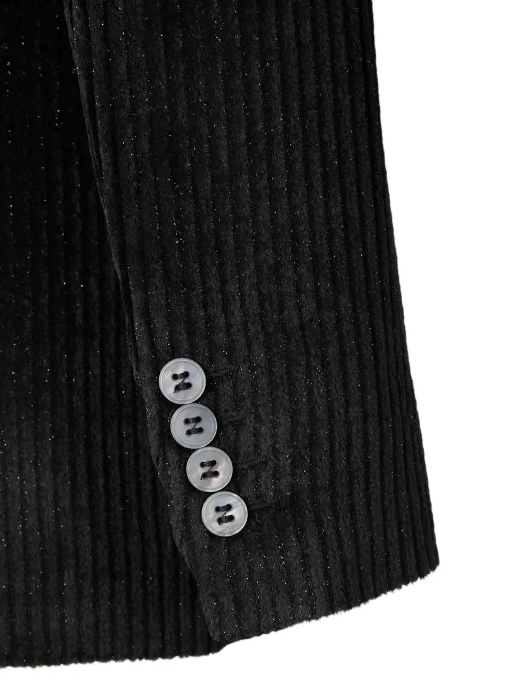 Черный вельвет, текстура, двубортная застежка, прорезные карманы с клапанами, манжеты на пуговицах, блестящие детали