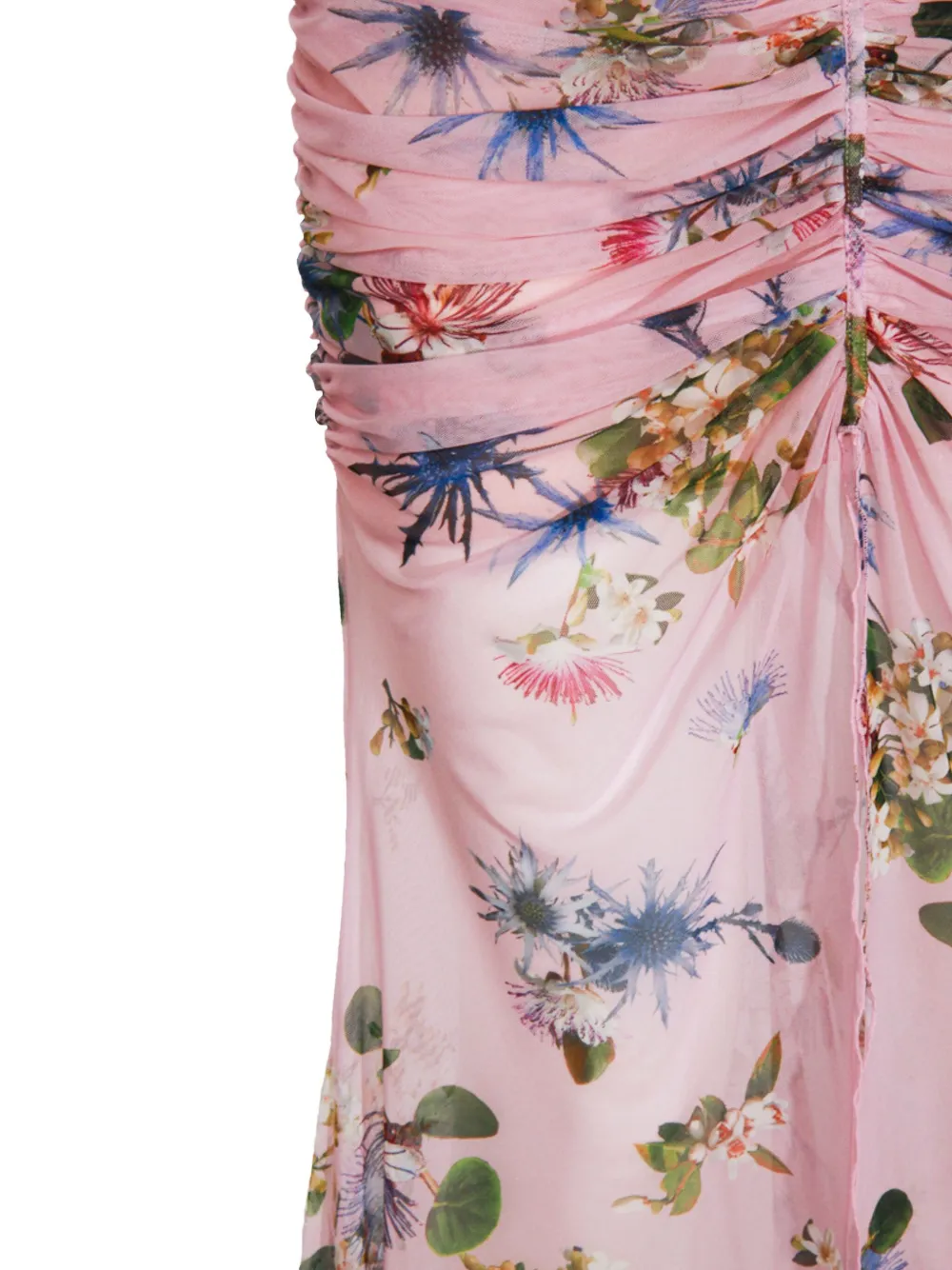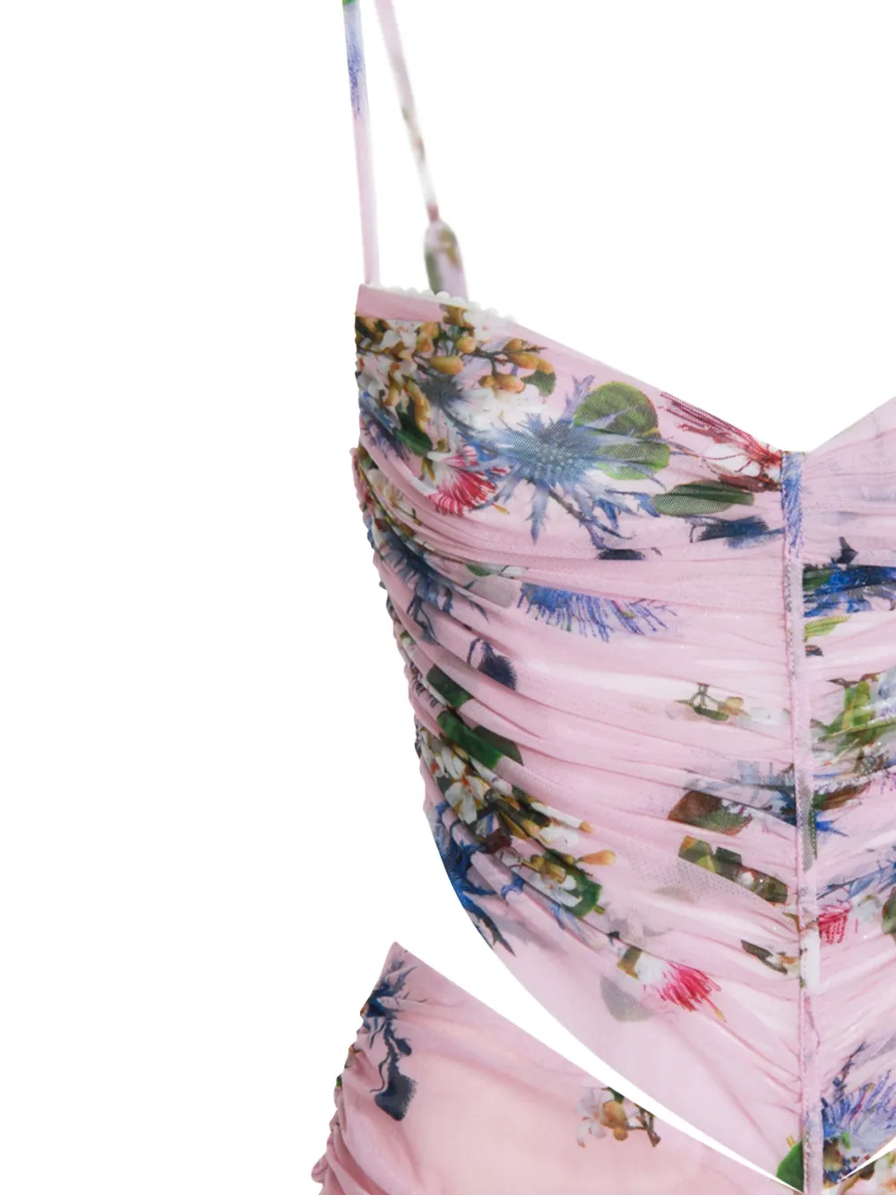 Розовое платье с цветочным принтом, вырезами, присборенной лифовой частью, тонкими бретельками и юбкой «русалка»