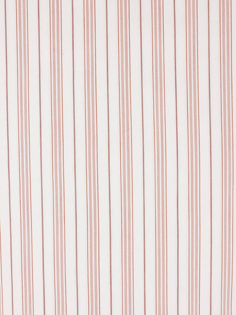 Белые и бежевые вертикальные полосы, классический воротник, застежка на пуговицы спереди, длинные рукава-буфы, манжеты на пуговицах, закругленный подол
