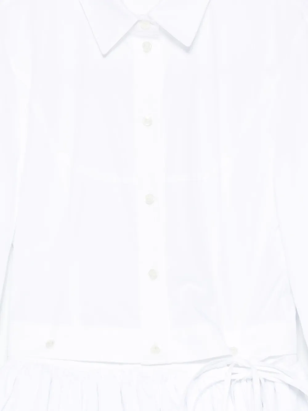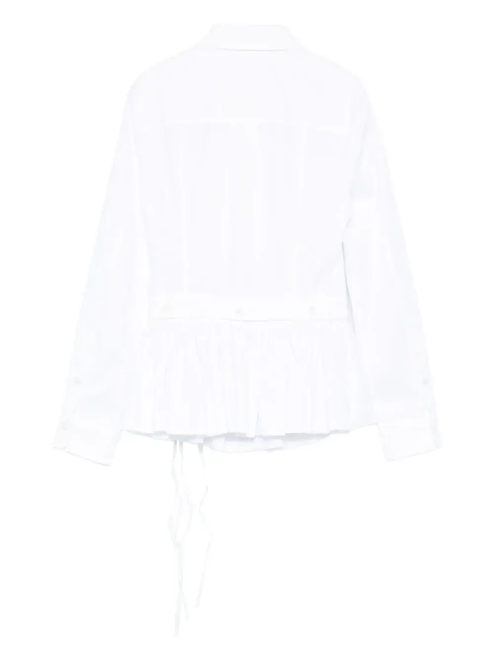 Белый цвет, застежка на пуговицы, длинные рукава, плиссированная вставка, завязывающиеся ленты
