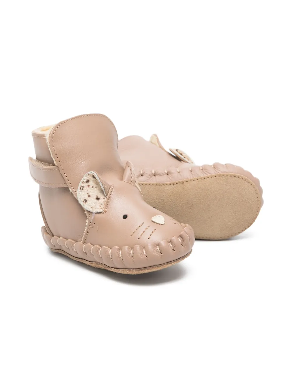 Светло-коричневый верх из кожи с дизайном "мышиные ушки", прошитая подошва, подкладка из овчины, застежка на липучке