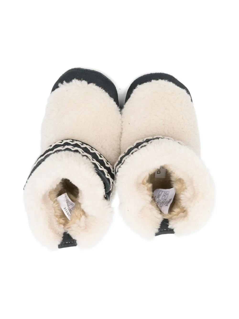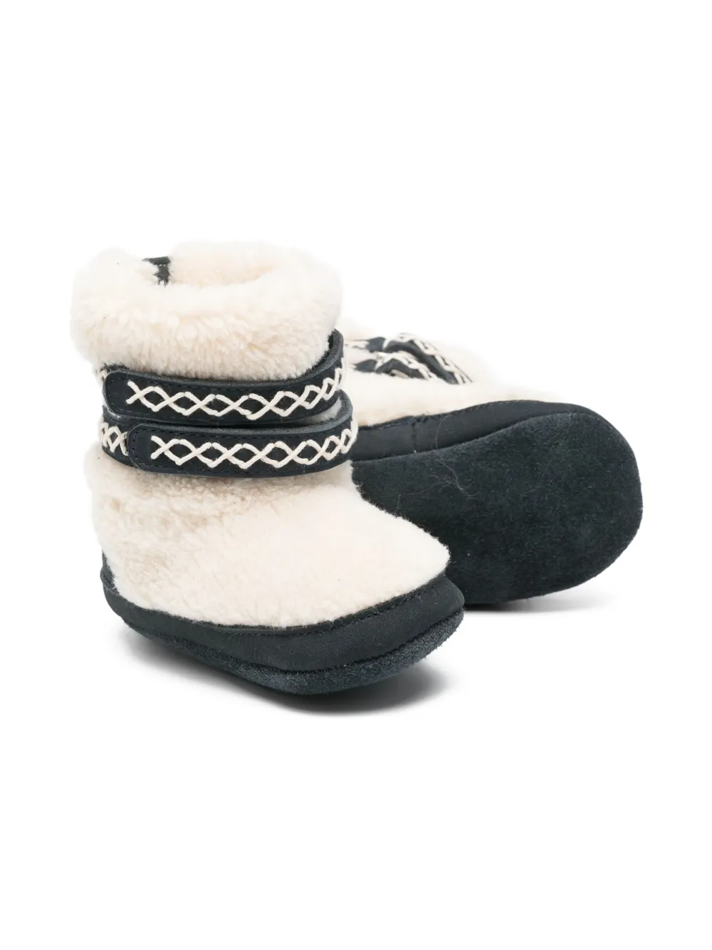 Овчина цвета «off-white», ремешки с узором, замшевая подошва, модель без застежки, отвороты