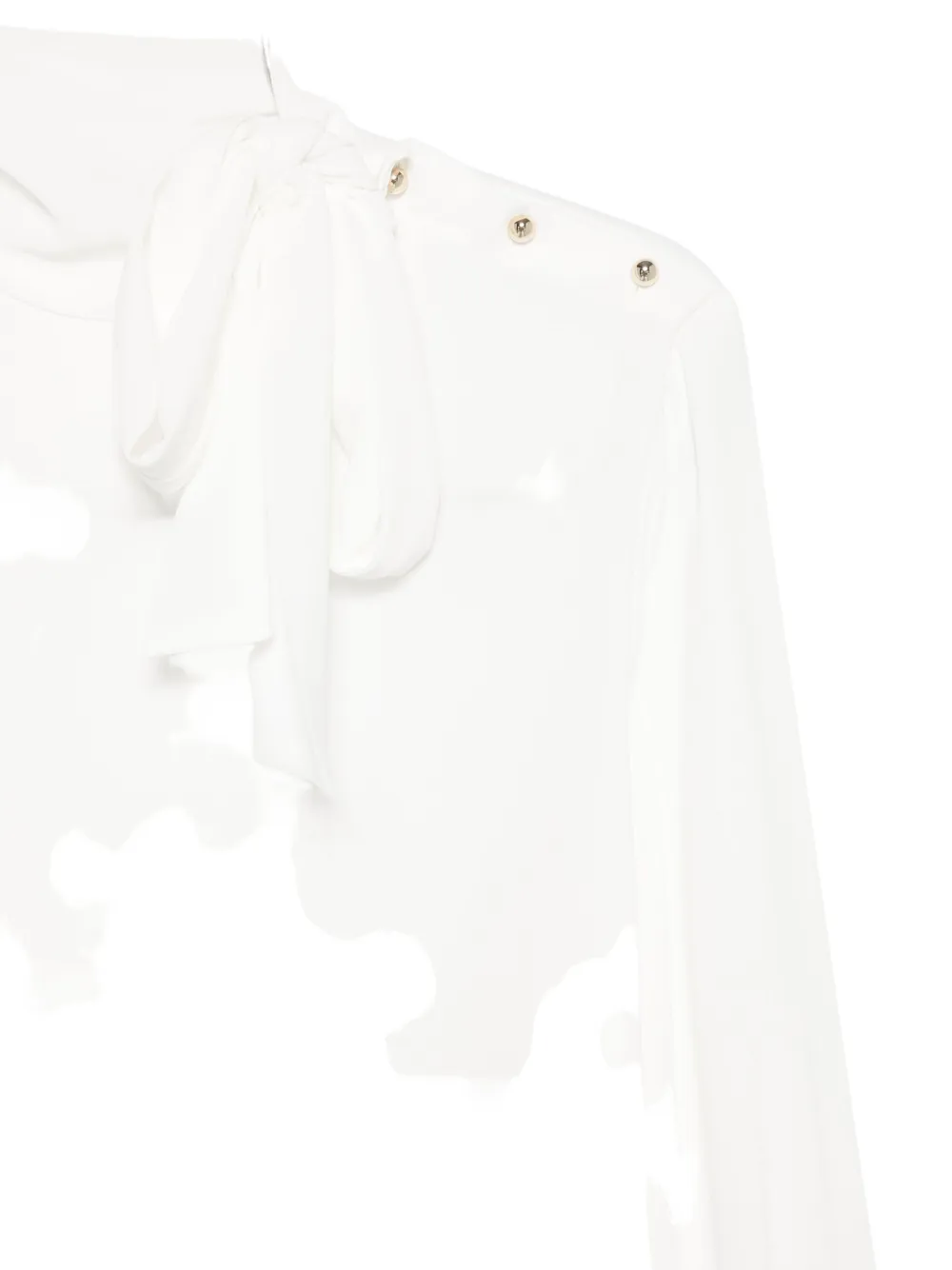 Белая блузка с галстуком на шею, пуговицами на плечах, длинными рукавами и манжетами на пуговицах