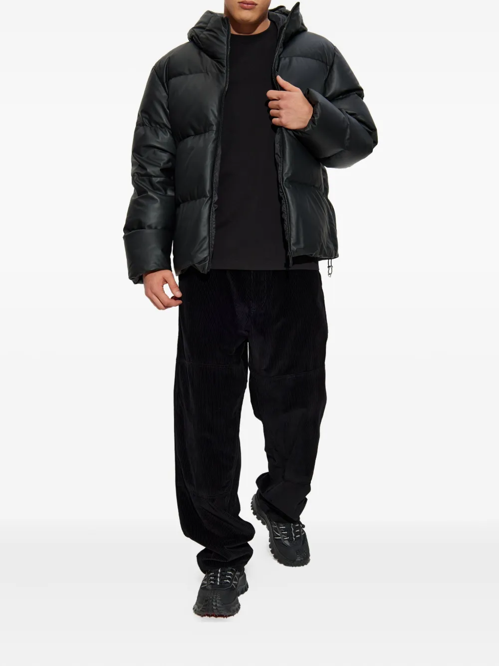 Черный пуховый дизайн, капюшон, застежка-молния спереди, нашивка с логотипом, регулируемый кулиской низ