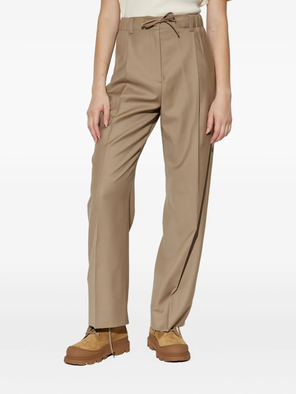 Бежевый цвет, застежка на кулиску, эластичный пояс, складки спереди, боковые карманы в шве, задний прорезной карман