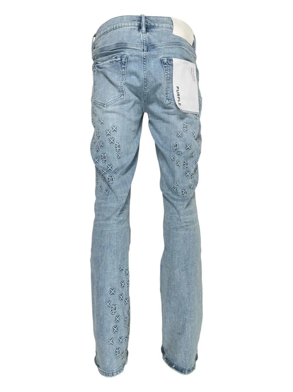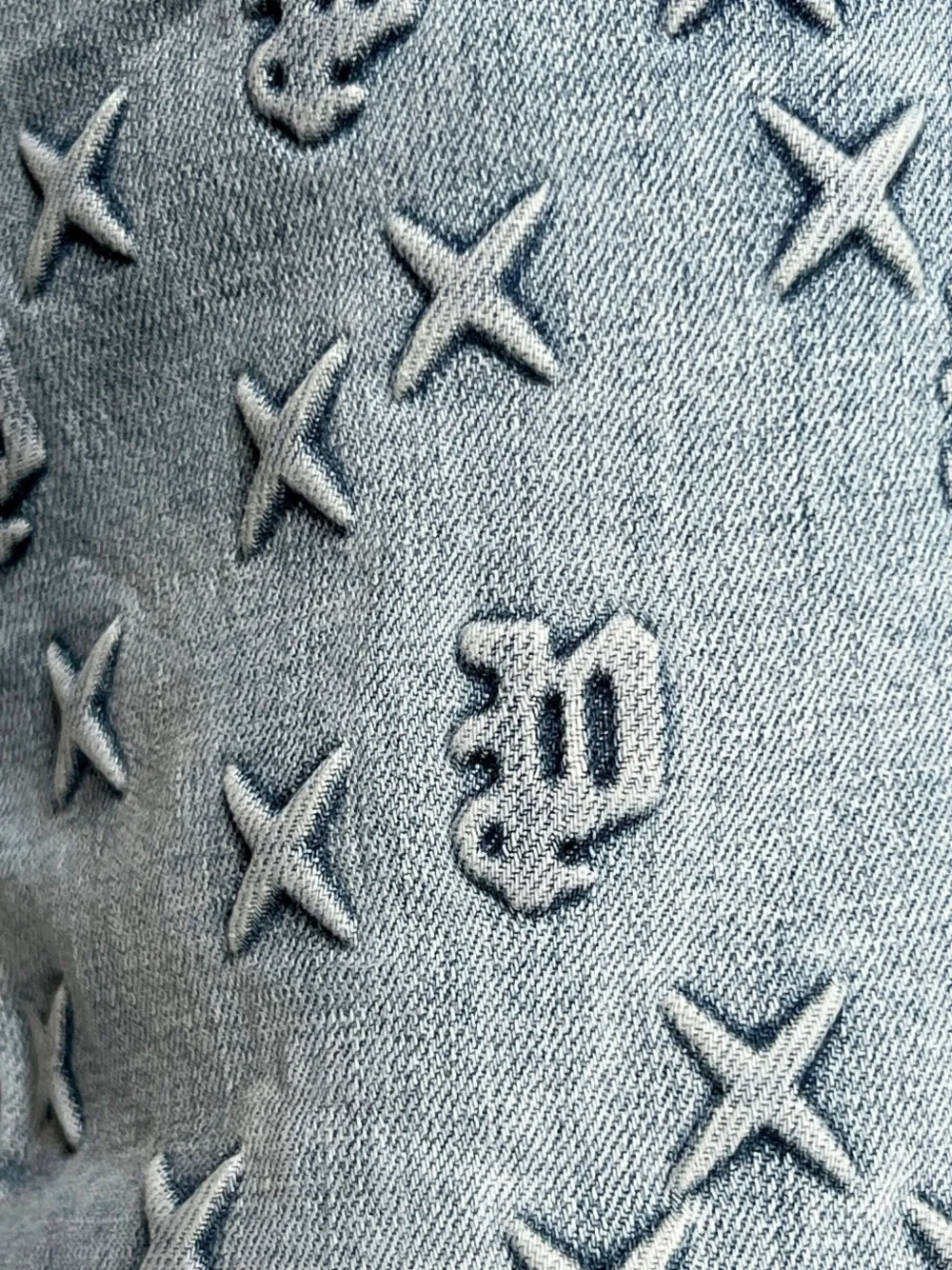 Светло-голубые расклешенные брюки с тисненым узором-логотипом и застежкой на пуговицах
