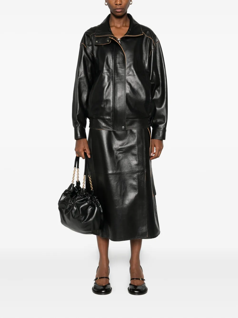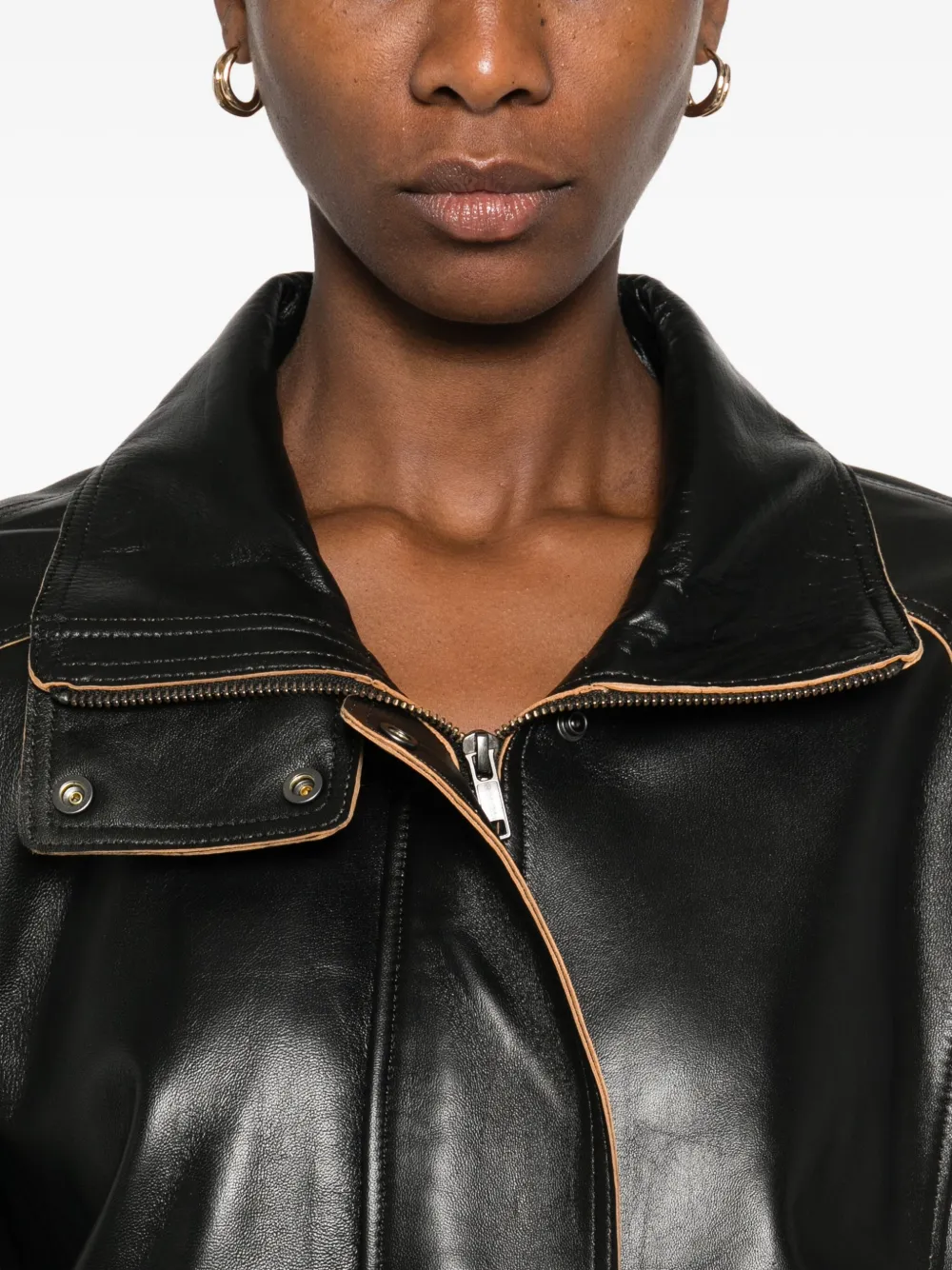 Черный кожа застежка-молния спереди эластичный низ боковые прорезные карманы воротник-стойка