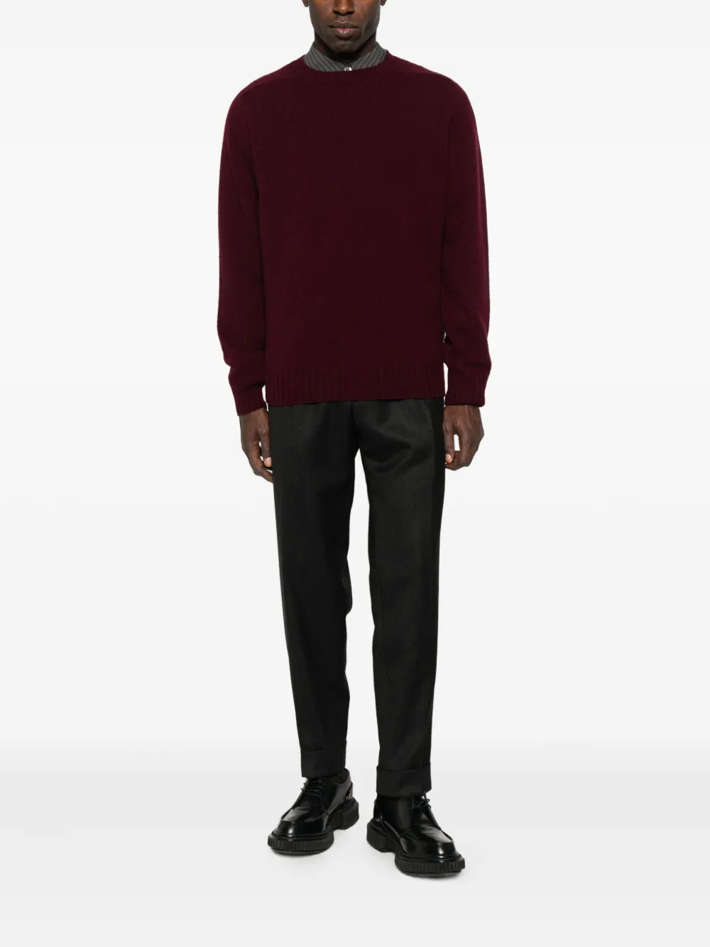 Бордовый вязаные манжеты и пояс длинные рукава круглый вырез
