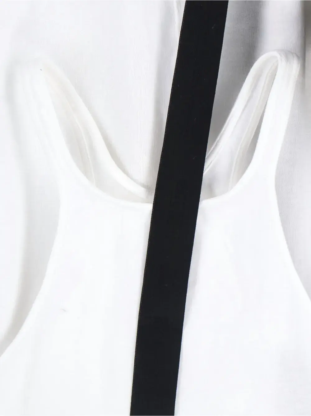 Белый топ в рубчик с асимметричным подолом, борцовской спинкой и черной деталью-лямкой