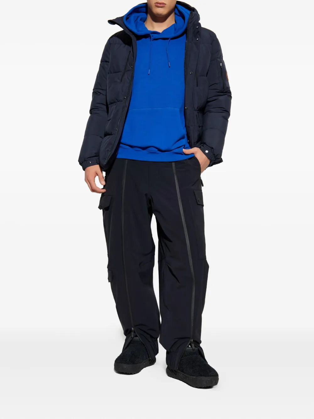 Темно-синяя стеганая куртка с капюшоном, молниями на карманах, длинными рукавами и фронтальными карманами
