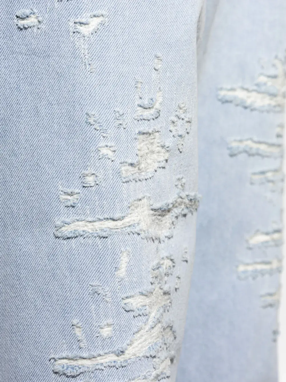 Светло-голубой цвет, эффект состаренности, необработанный край, пять карманов, логотип, петли для ремня