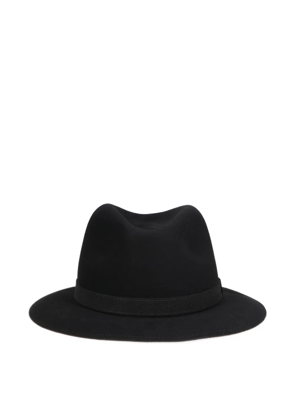 Черный фетровый материал, плоская тулья, лента из репса, широкие поля, лаконичный дизайн