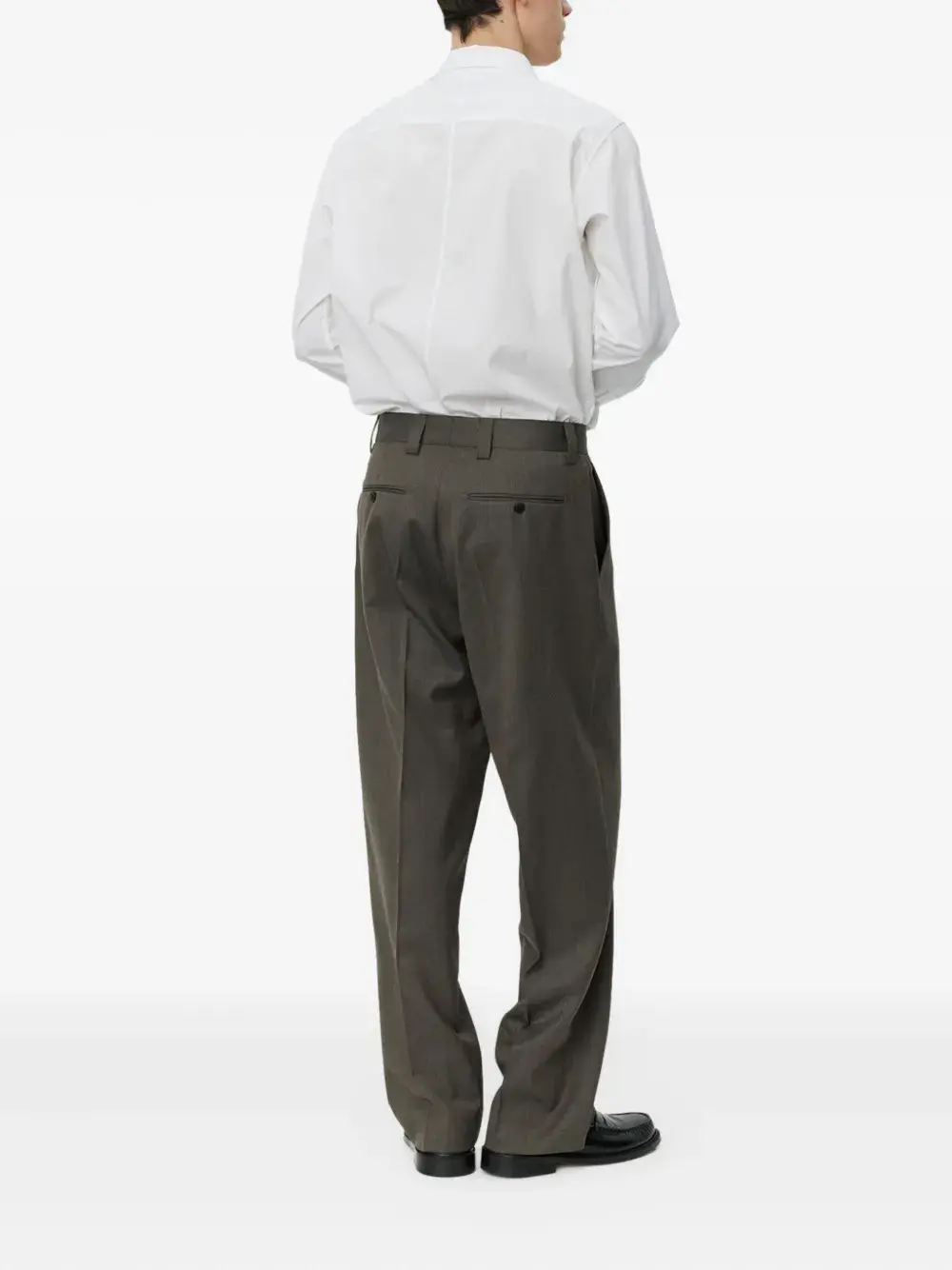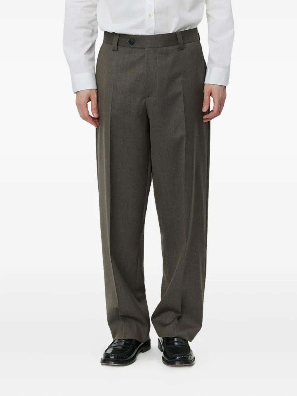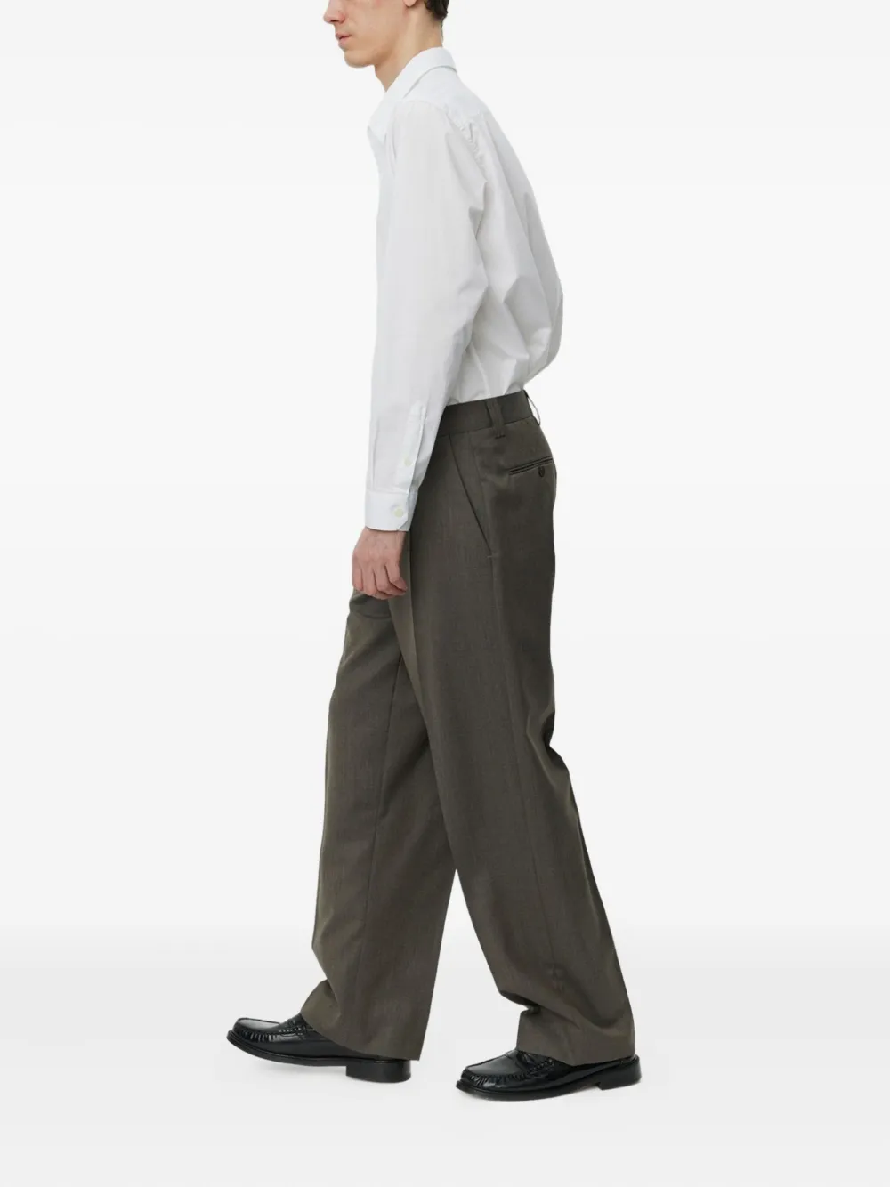 Тауповые брюки с защипами спереди, пуговичной застежкой, прорезными карманами и ровным передом