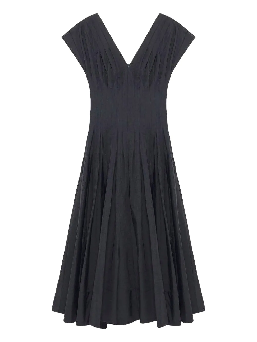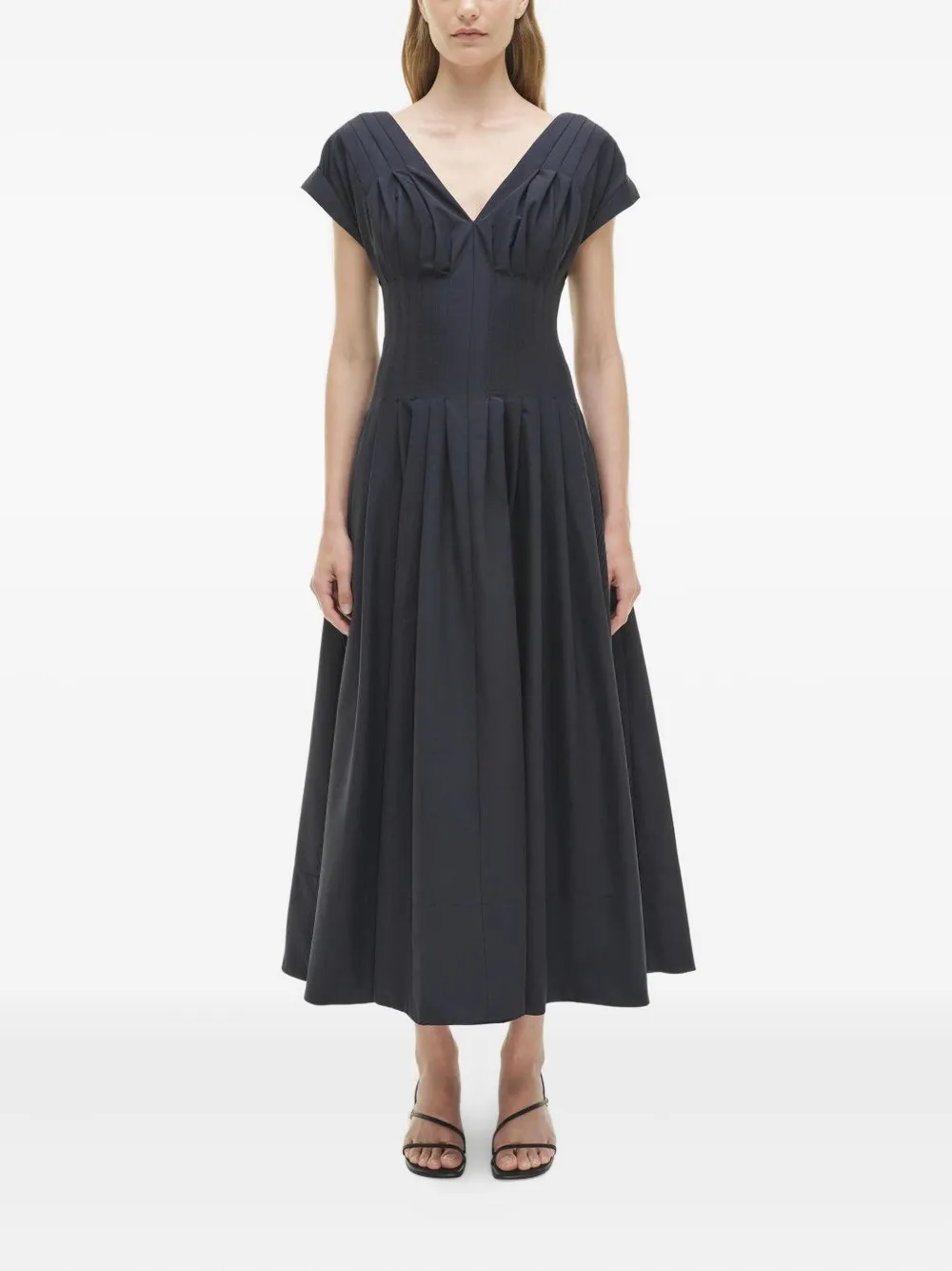 Темно-синий V-образный вырез короткие рукава плиссированные детали плиссированная юбка прямой низ средняя длина