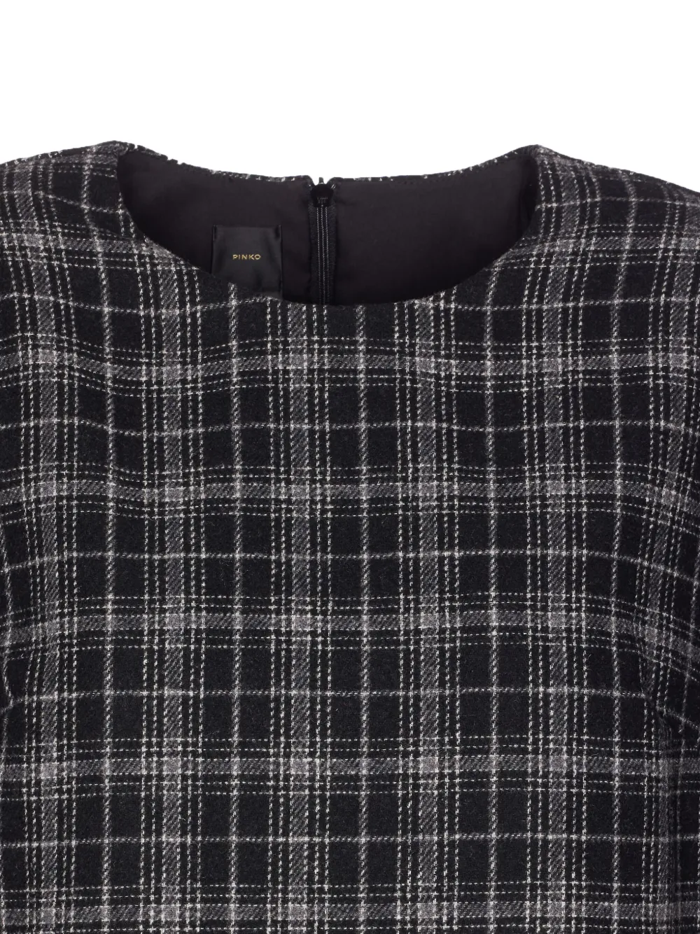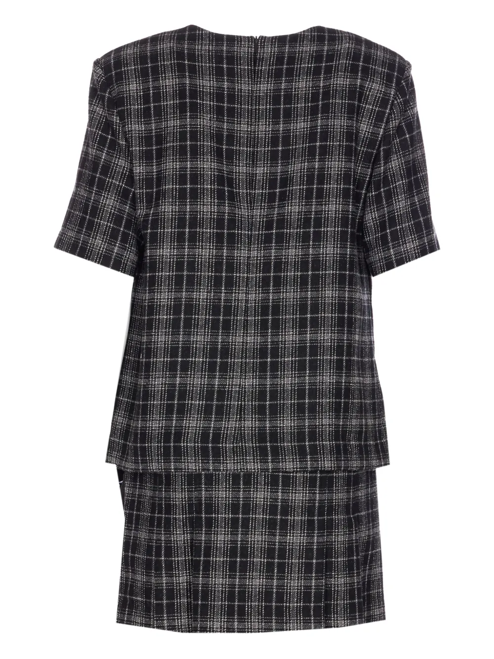 Черный с клетчатым узором, короткие рукава, круглый вырез, застежка-молния на спине, пояс на талии, усиленные плечи