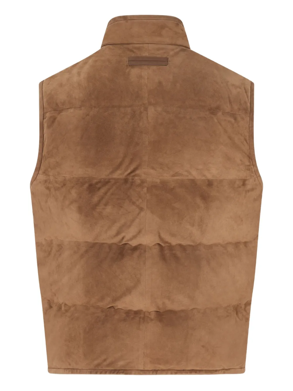 Коричневая замшевая кожа, стеганый дизайн, застежка-молния, высокий воротник, без рукавов