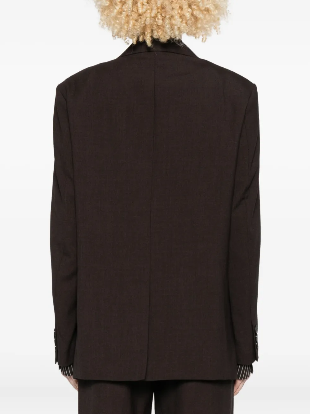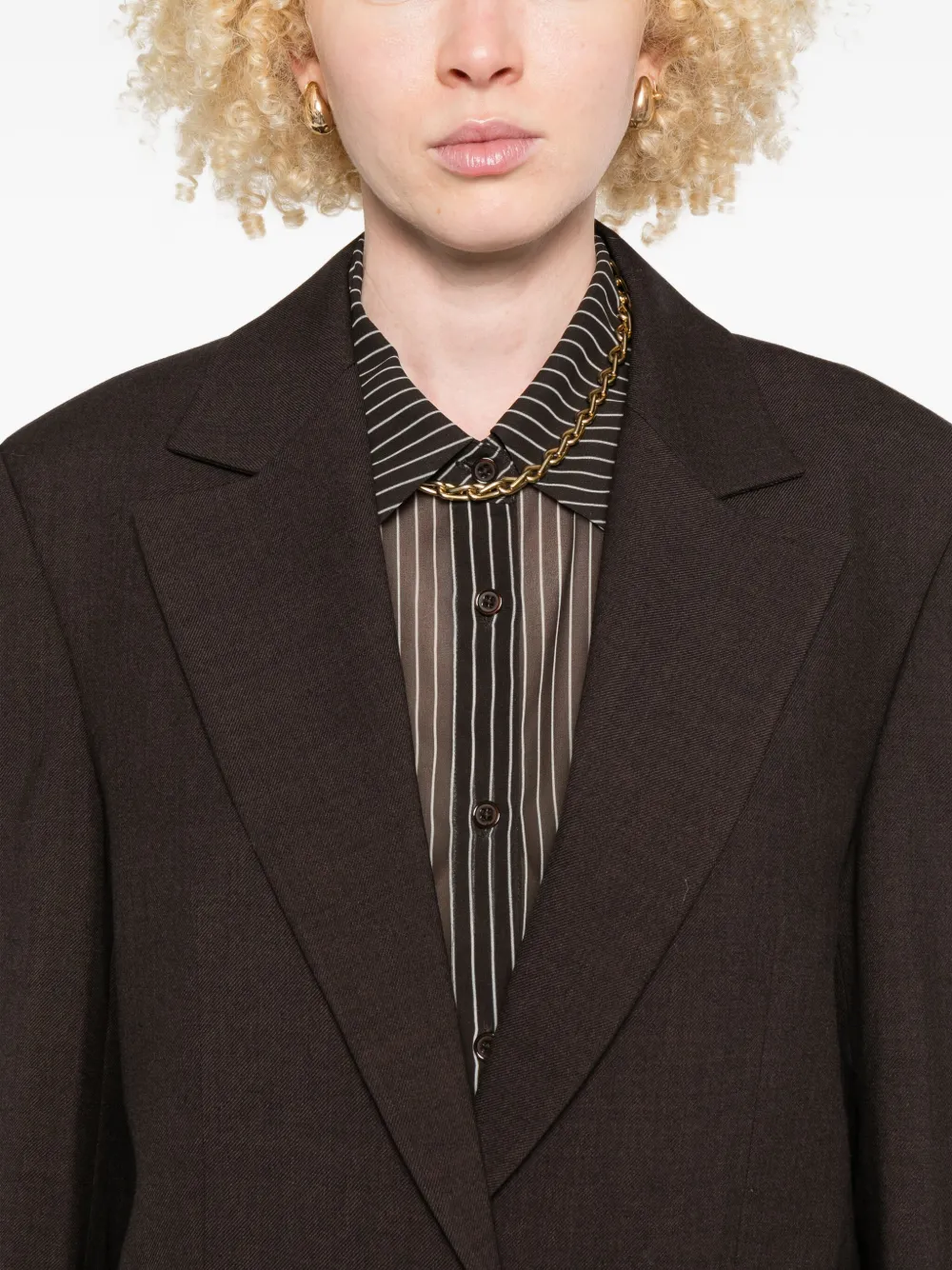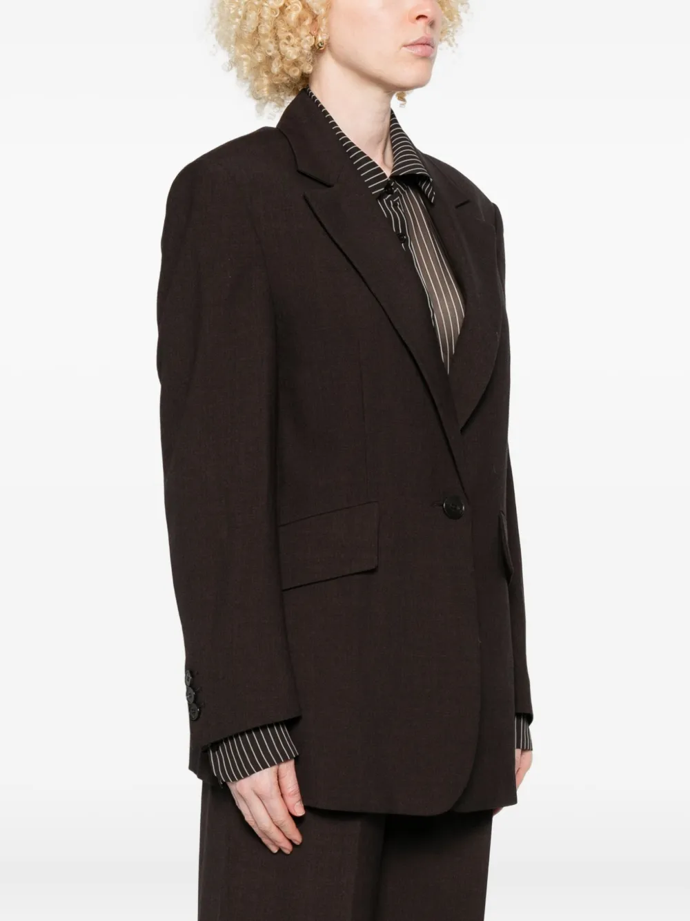 Коричневый пиджак с застежкой на одну пуговицу, лацканами с вырезом, длинными рукавами, клапанными карманами и прямым подолом