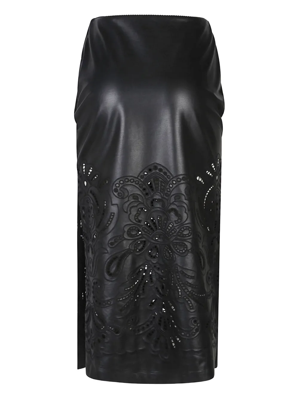 Черная кожаная юбка миди с лазерной перфорацией, цветочным узором и прямым подолом
