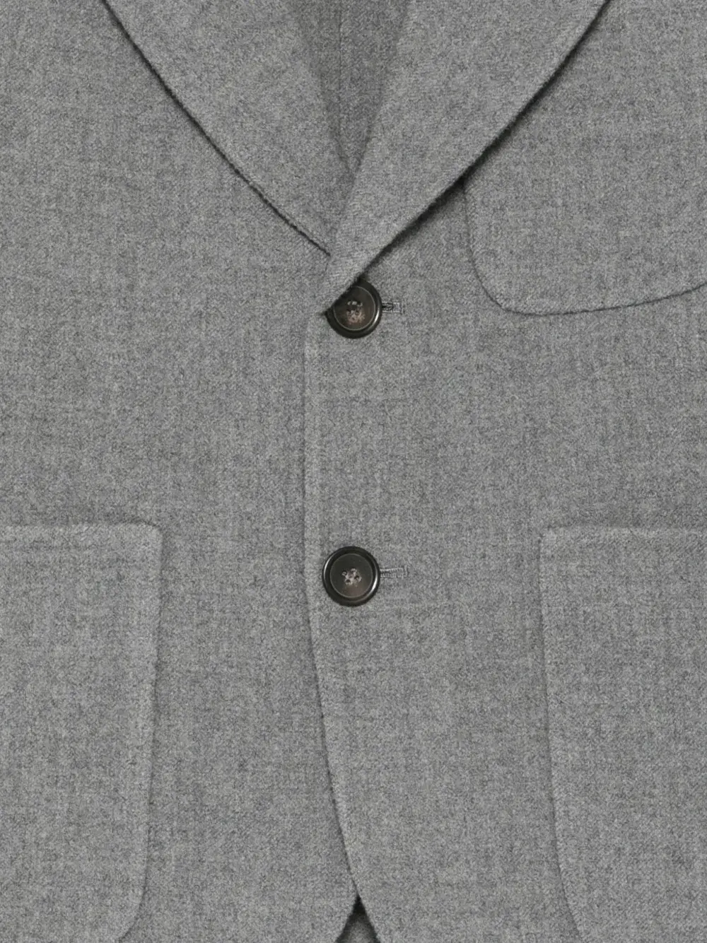 Темно-серый цвет, лацканы с вырезом, застежка на пуговицы спереди, длинные рукава, накладные карманы спереди, прямой нижний край