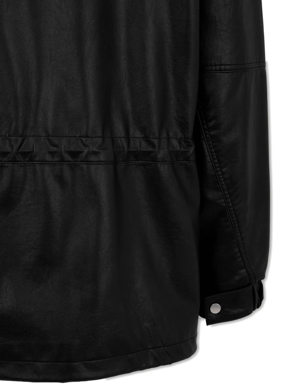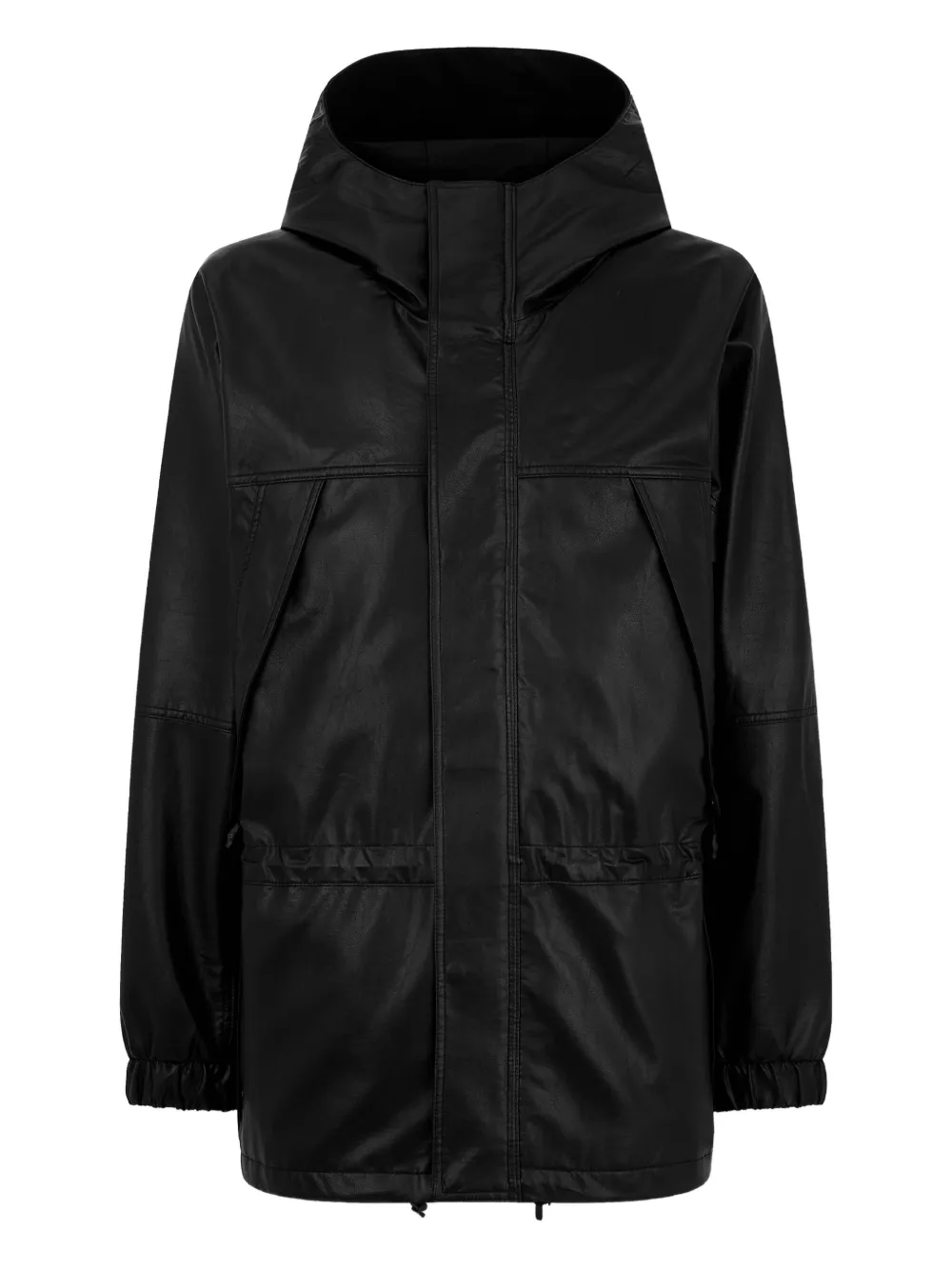 Черная искусственная кожа, кулиска по подолу, застежка на кнопки, капюшон, застежка-молния