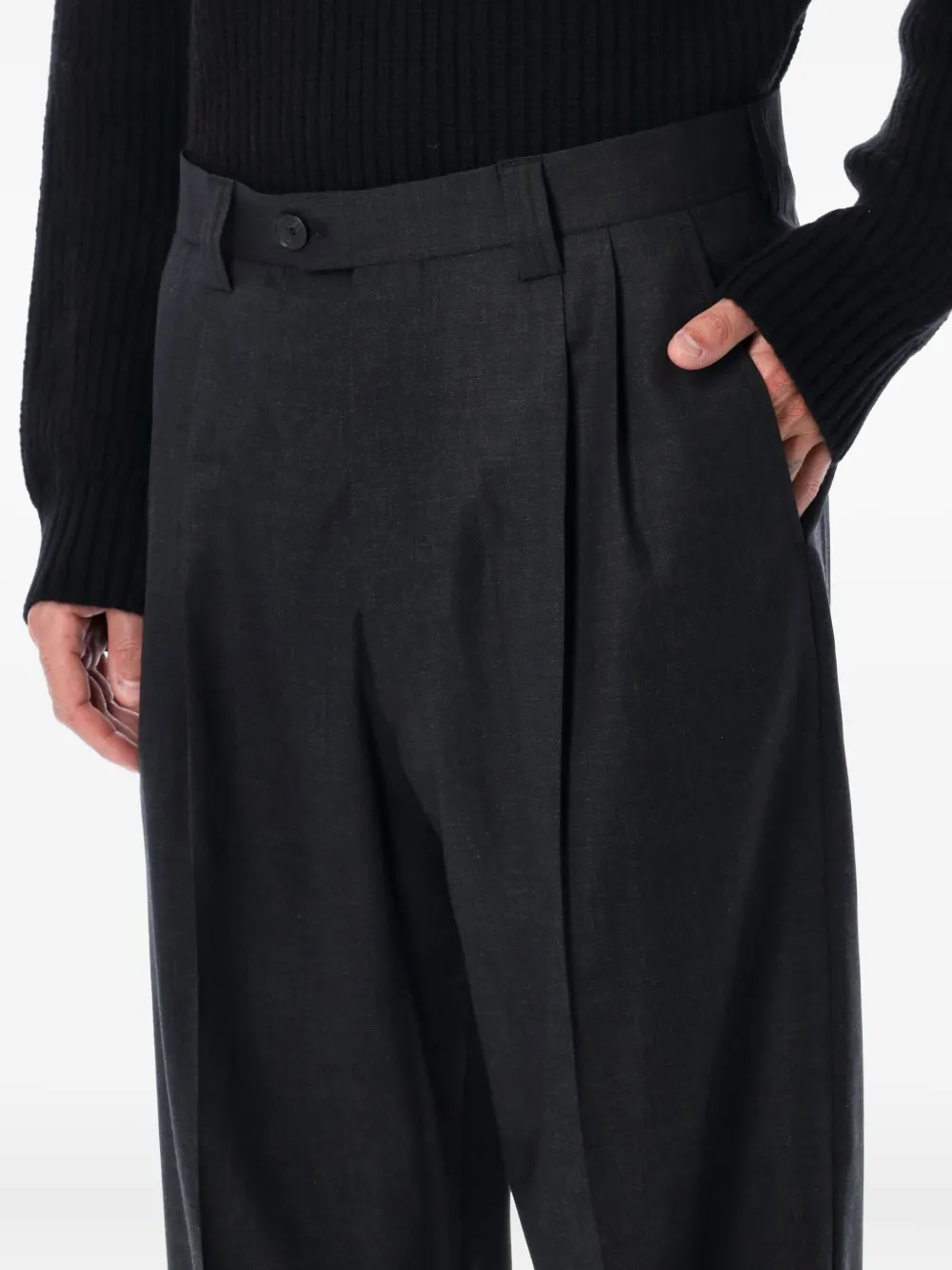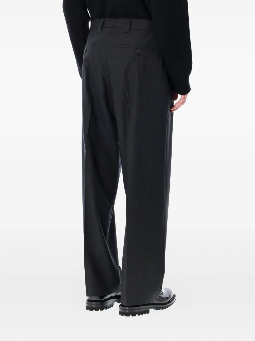 Темно-серый защипы спереди застежка на пуговицах прямые брючины боковые прорезные карманы задние карманы с листочкой
