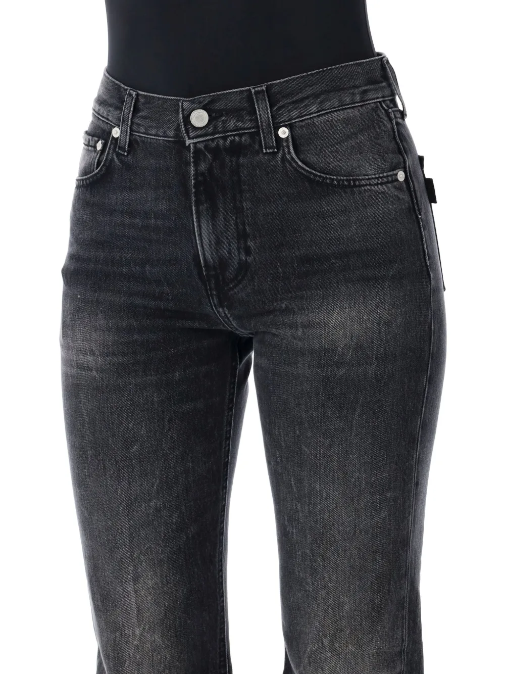 Черные джинсы с эффектом выцветания, расклешенные штанины, застежка на пуговицы, пять карманов, высокая посадка