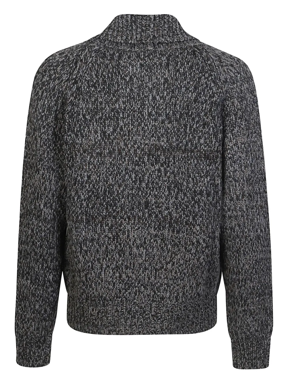 Серый шерстяной трикотаж застежка на два ряда пуговиц воротник-шаль накладные карманы крапчатый узор