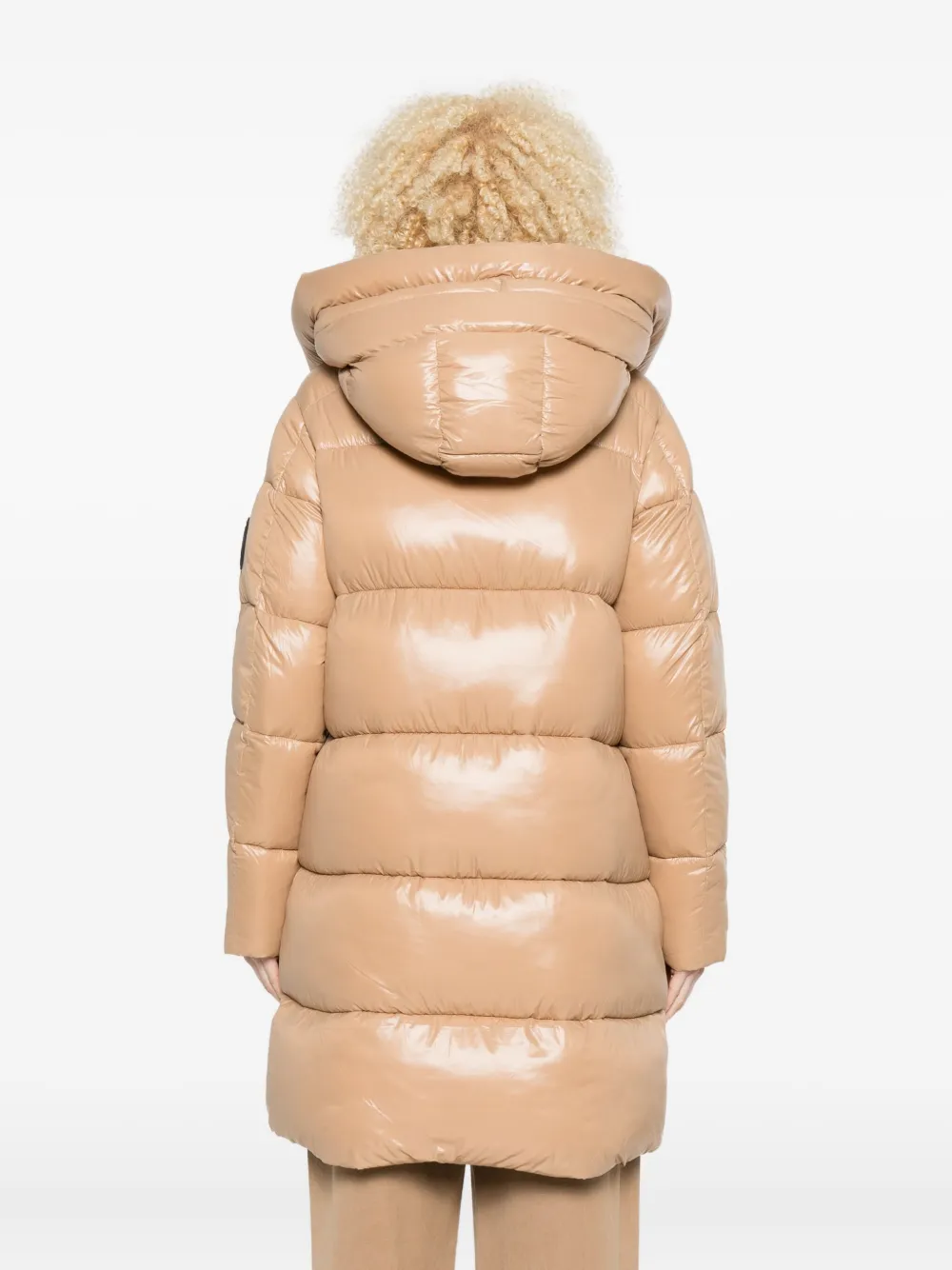 Бежевый стеганый дизайн, высокий воротник, застежка на молнии, длинные рукава, капюшон на кулиске