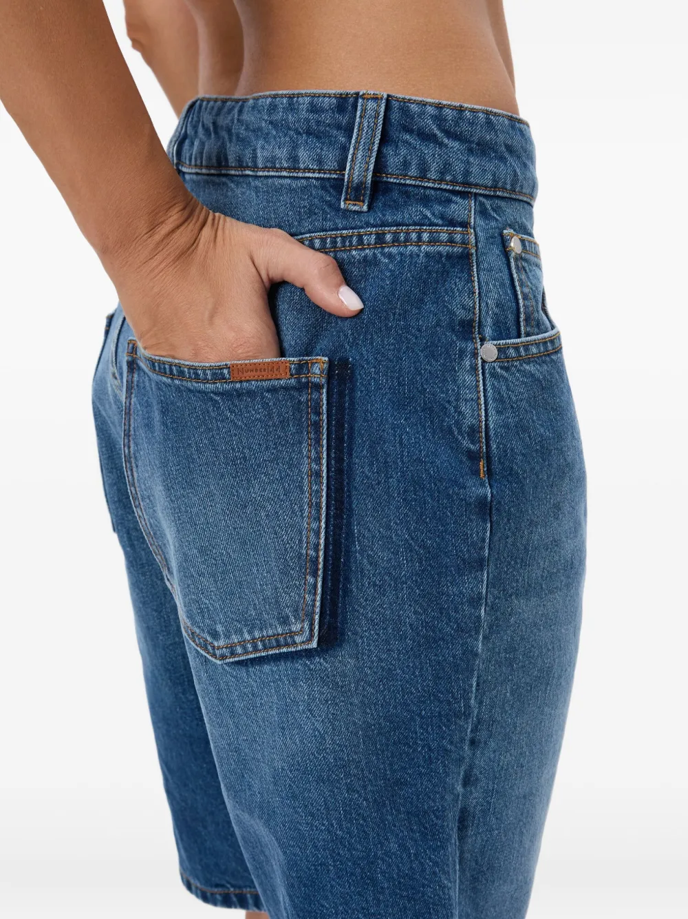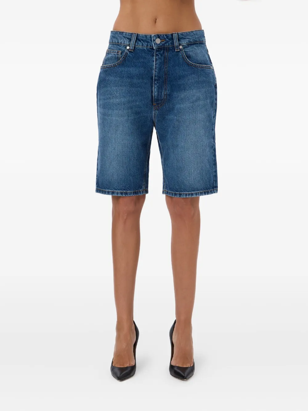 Синий цвет, пять карманов, застежка на пуговицах, высокая талия, прямой край, длина до середины бедра